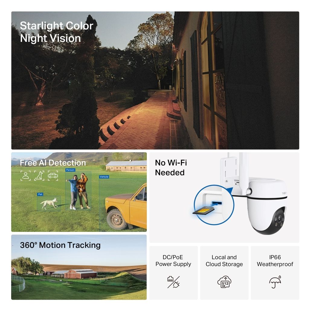 Unterstützt durch TP-Links 4G-Netzwerktechnologie, verbindet sich die Tapo C501GW zuverlässig über 4G LTE-Netze. Ideal für Orte wie Garagen, Ferienhäuser, Lagerhallen und Bauernhöfe, wo kein konstantes WLAN verfügbar ist. Einfach eine 4G-SIM-Karte (nicht enthalten) einlegen, um eine einfache und unkomplizierte Internetverbindung einzurichten.