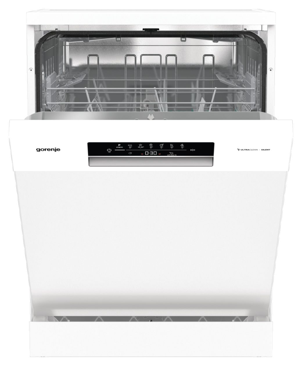 Das ergonomisch geformte Bedienfeld bietet hervorragende Sicht und Kontrolle über den Spülprozess und ausgewählte Einstellungen. Es ermöglicht die einfache Auswahl des richtigen Programms und andere spezielle Einstellungen.