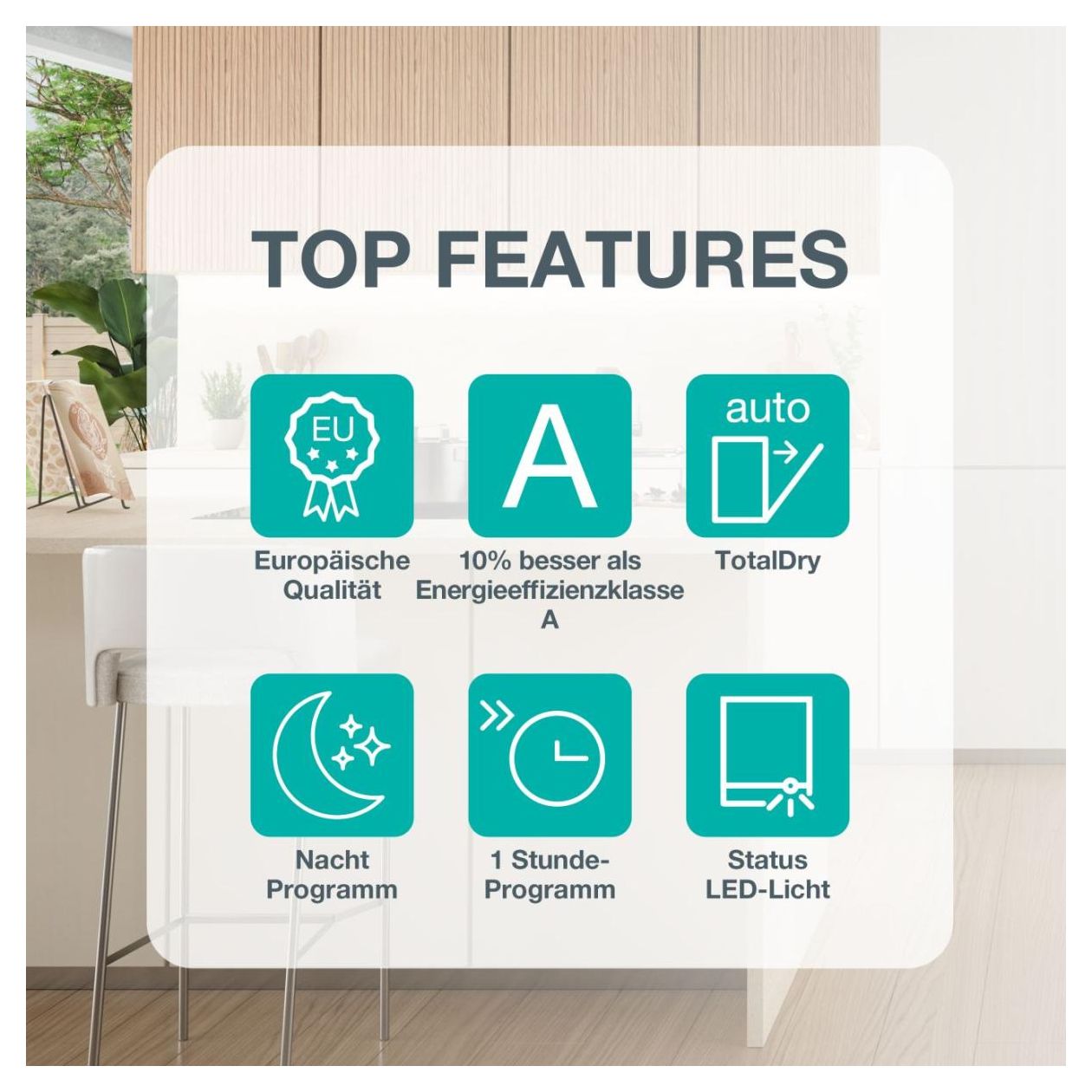 Ein umweltfreundlicher, hocheffizienter Einbau-Geschirrspüler, der den Energieverbrauch senkt, ohne an Leistung einzubüßen. Mit einer herausragenden Energieeffizienzklasse von A-10% verbraucht er nur 0,5 kWh pro Reinigungszyklus* und ist damit eine intelligente und kostengünstige Wahl für jeden Haushalt. Genießen Sie makelloses Geschirr und sparen Sie bei Ihrer Stromrechnung!*Interne Tests haben ergeben, dass die entsprechenden Modelle mit verbesserten Reinigungsparametern bis zu 10 % effizienter sind als erforderlich, um den Grenzwert der Energieeffizienzklasse A gemäß der Verordnung (EU) 2019/2014 zu erreichen.