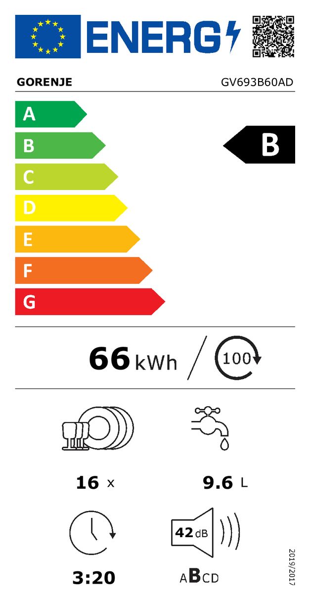 Die GV693B gehört zur Energieeffizienzklasse B. Sie weist einen Wasserverbrauch von 9,6 l pro Zyklus und einen Energieverbrauch von 66 kWh pro 100 Zyklen auf.
