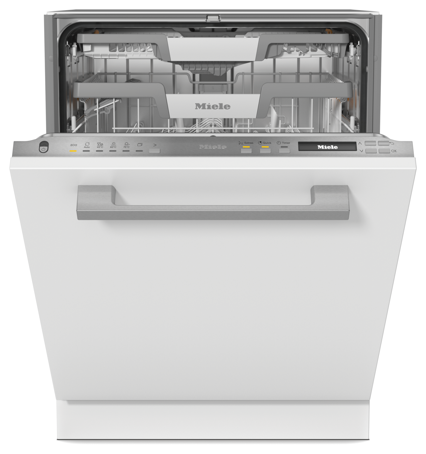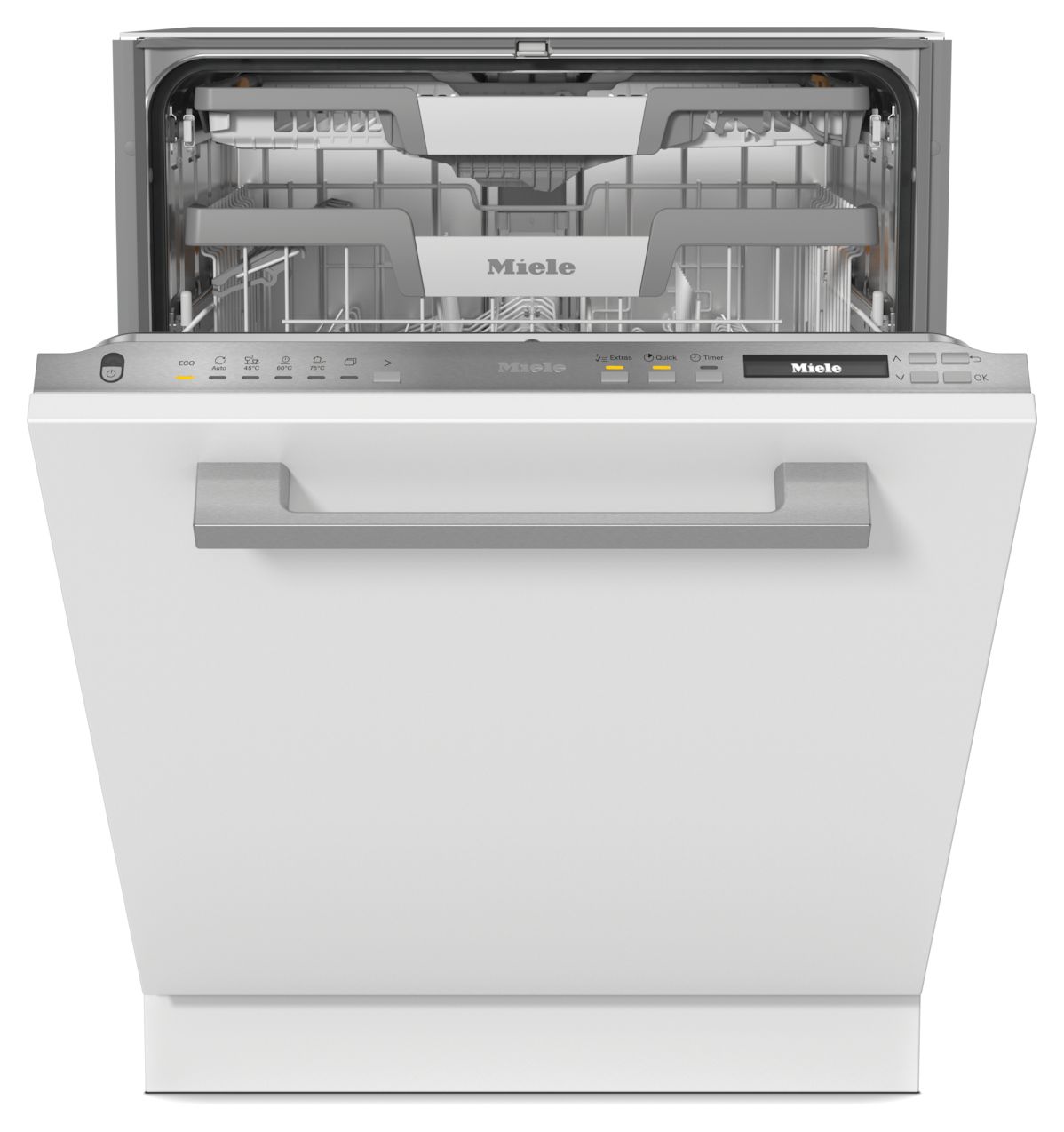 Miele Einbau-Geschirrspüler lassen sich problemlos in ergonomischer Höhe einbauen. Mit der FrontFit Technik bietet Miele spezielle Modelle, die das Spaltmaß zum Sockel oder zur angrenzenden Front auf ein Minimum reduzieren. Dadurch entsteht ein optimales Fugenbild. Dank der intelligenten Gleit-Mechanik ist die Bedienung besonders komfortabel.
