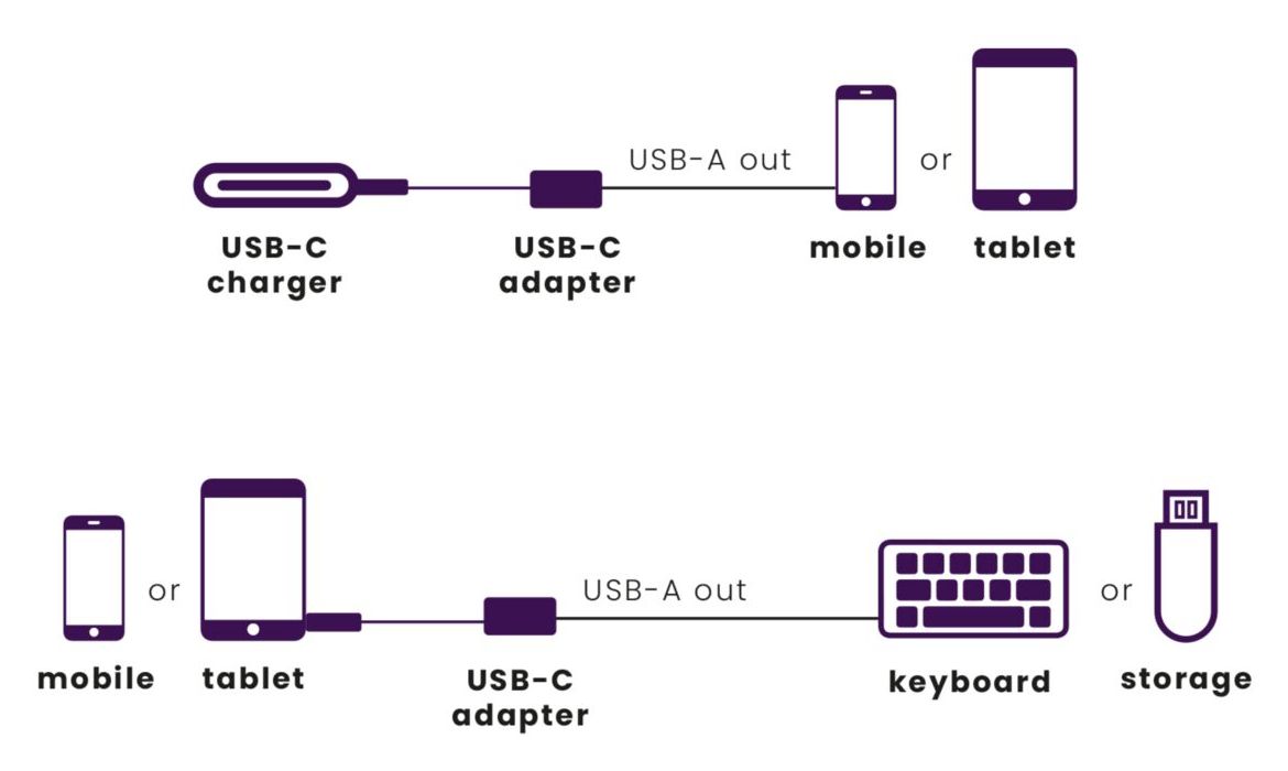 Schließen Sie z. B. eine Tastatur oder eine Maus an ein iPad an. Oder laden Sie Ihr altes USB-A-Gerät über ein Gerät, das keinen USB-A-Anschluss mehr hat (z. B. ein neues Auto), auf. So können Sie Ihre alten Ladekabel weiterverwenden und müssen keine neuen kaufen.