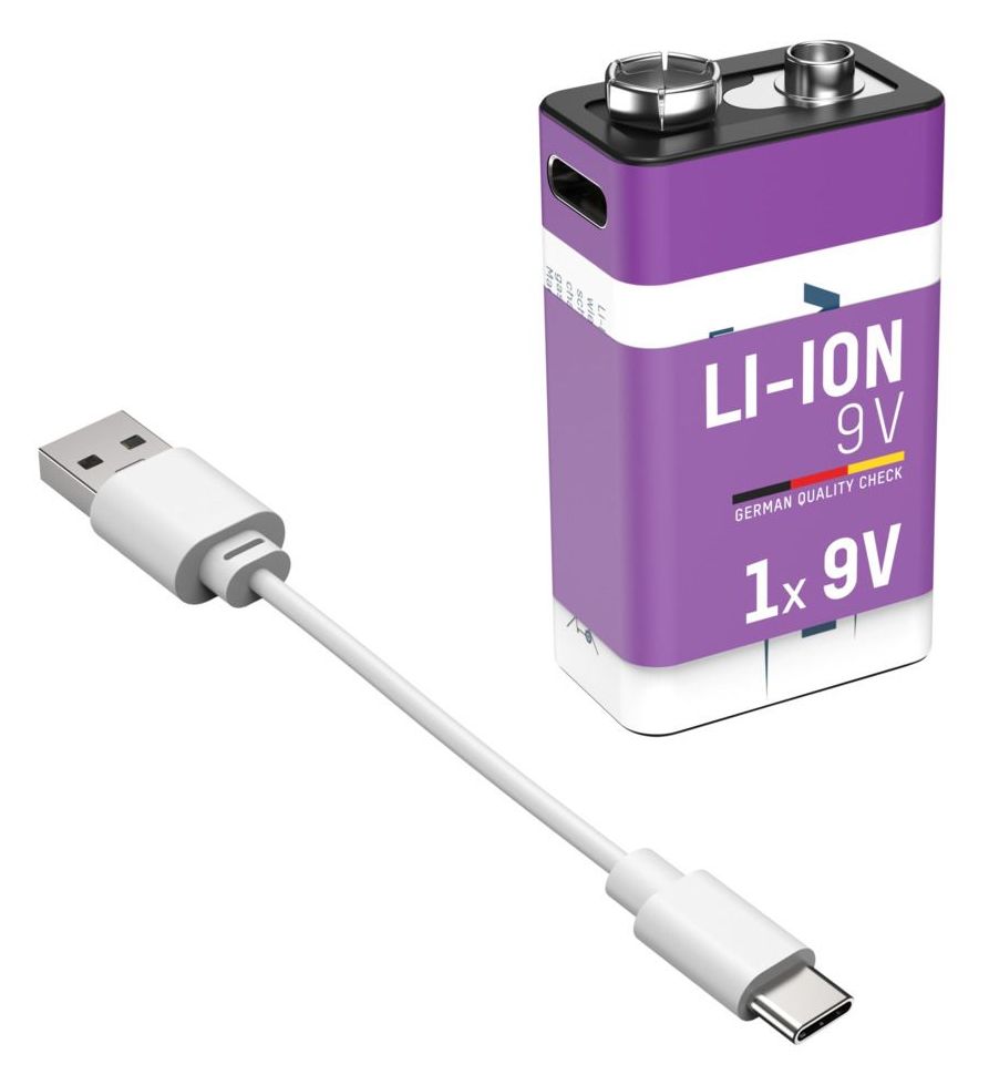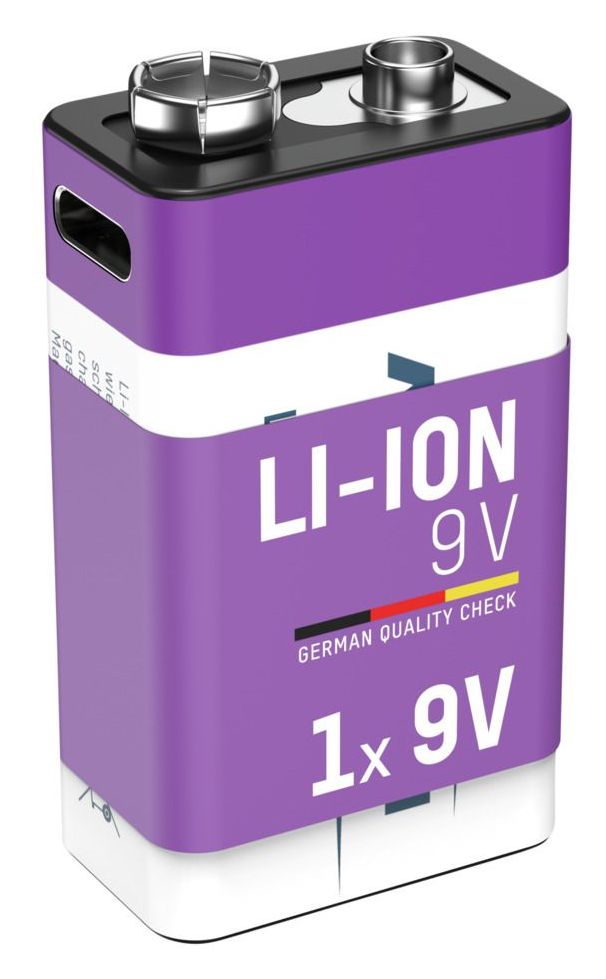 9V E-Block Lithium-Ionen Akku - 9 V / Typ 400 (min. 340 mAh) / 3,7 Wh - Type C Ladung - geschützter Akku aufgrund Sicherheitsbeschaltung
