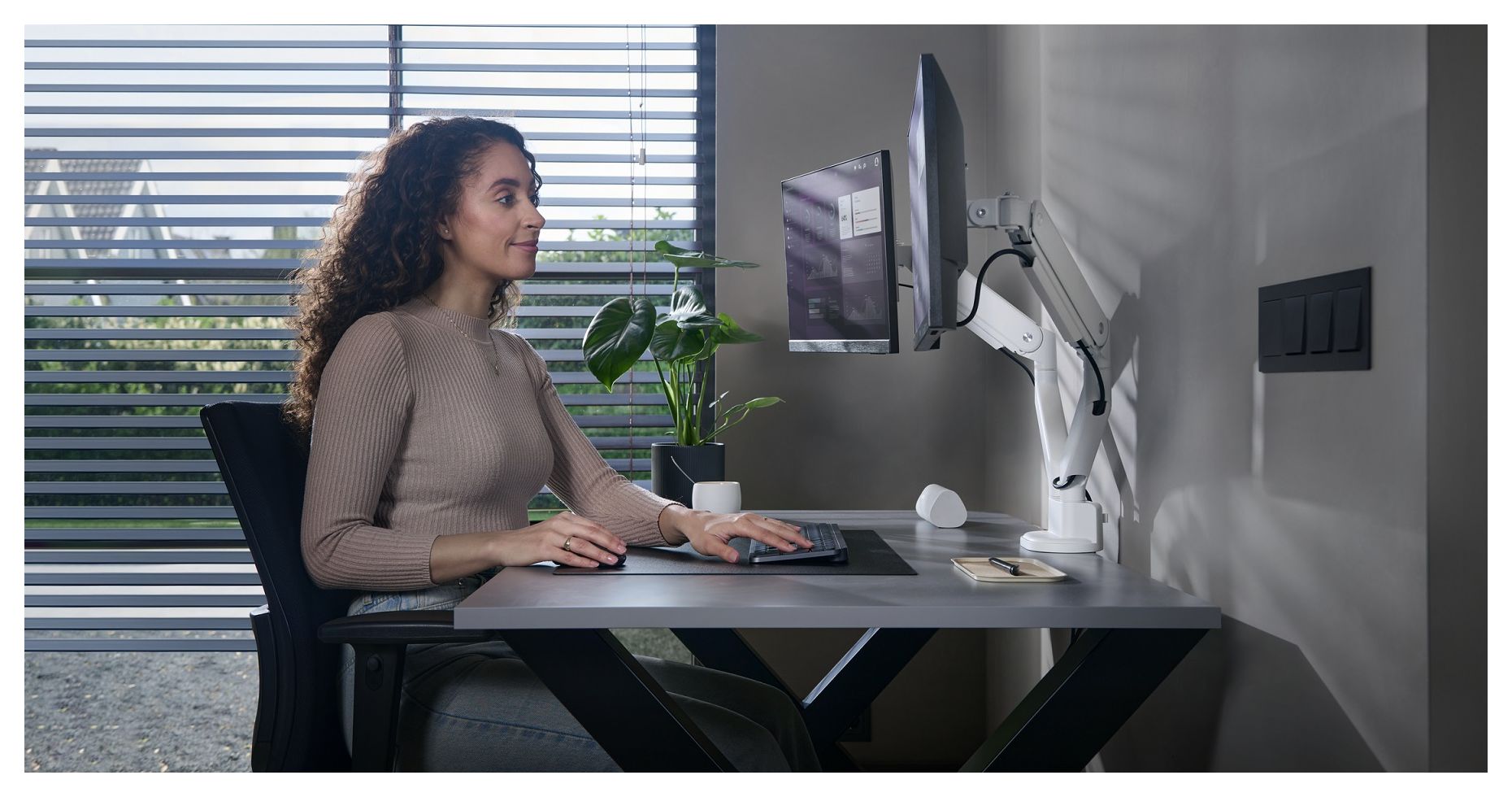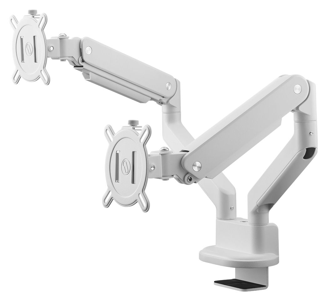 Verwandeln Sie Ihren Arbeitsbereich mit unserer Doppelmonitorhalterung in eine beindruckend elegante Umgebung. Montieren Sie beide Monitore ganz einfach nebeneinander und schaffen Sie so wertvollen Platz auf dem Schreibtisch sowie eine perfekt aufgeräumte, organisierte Arbeitsumgebung – etwas, was Sie sich schon immer gewünscht haben.