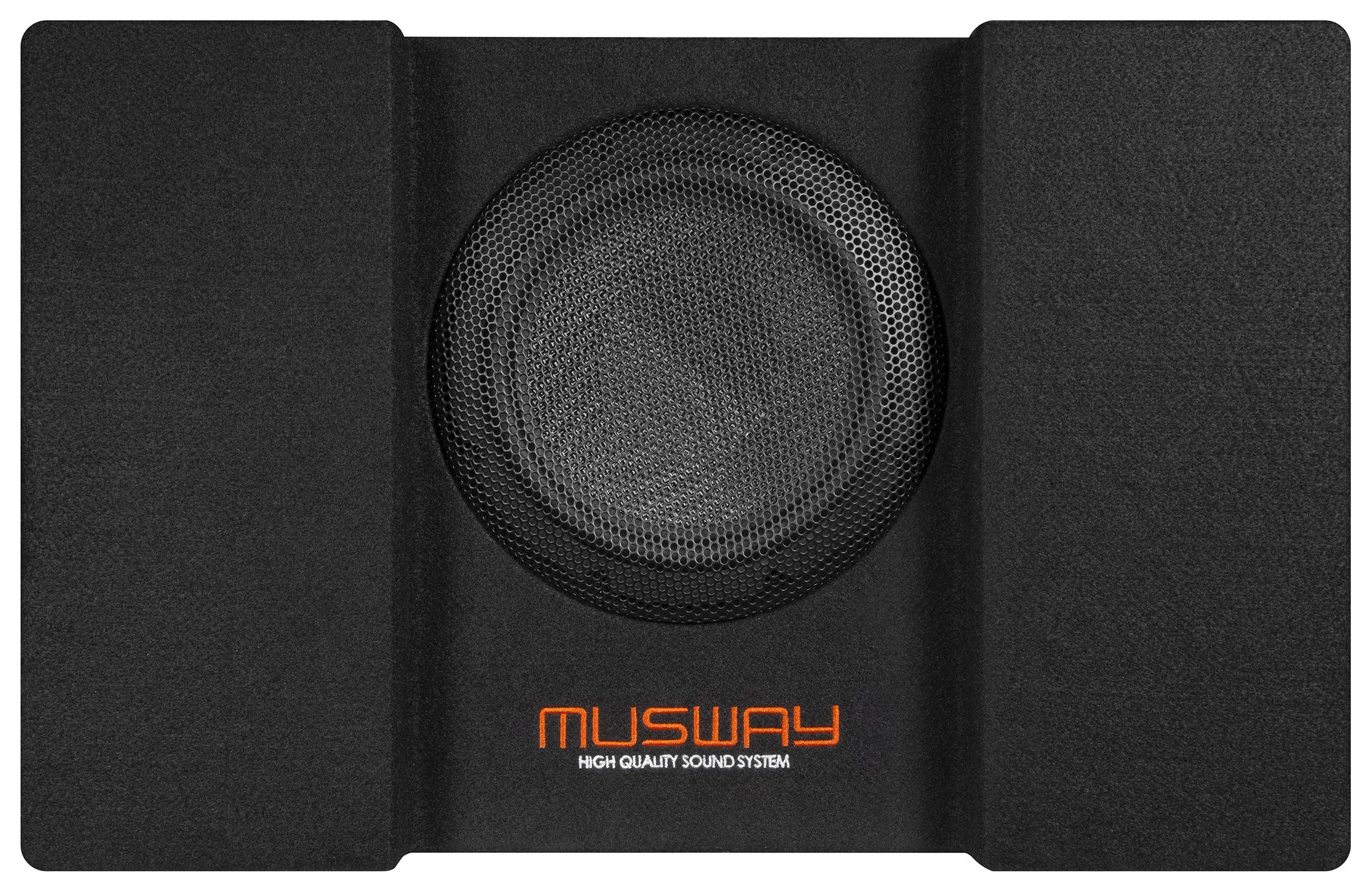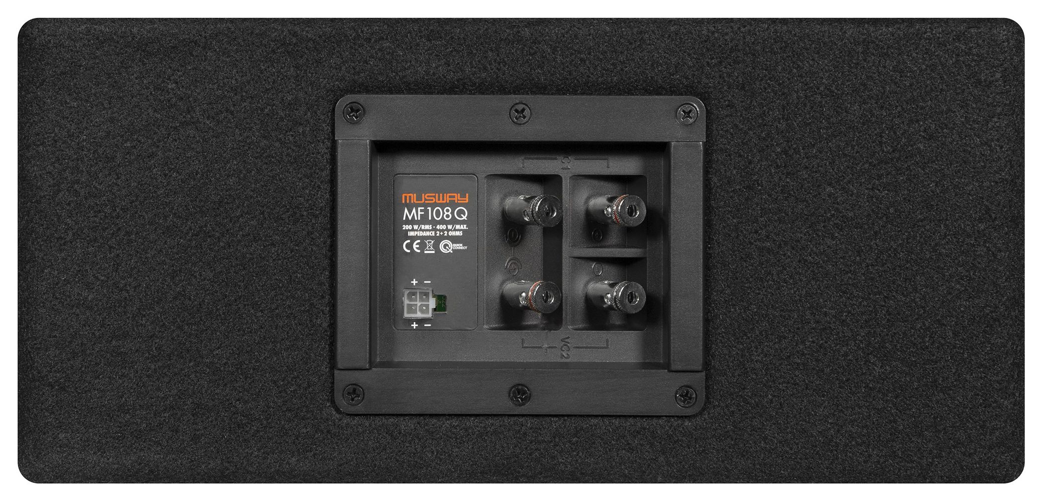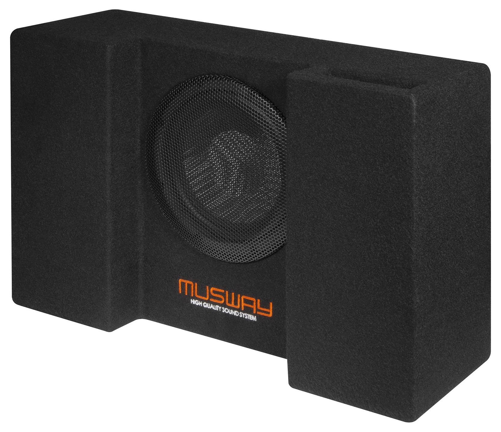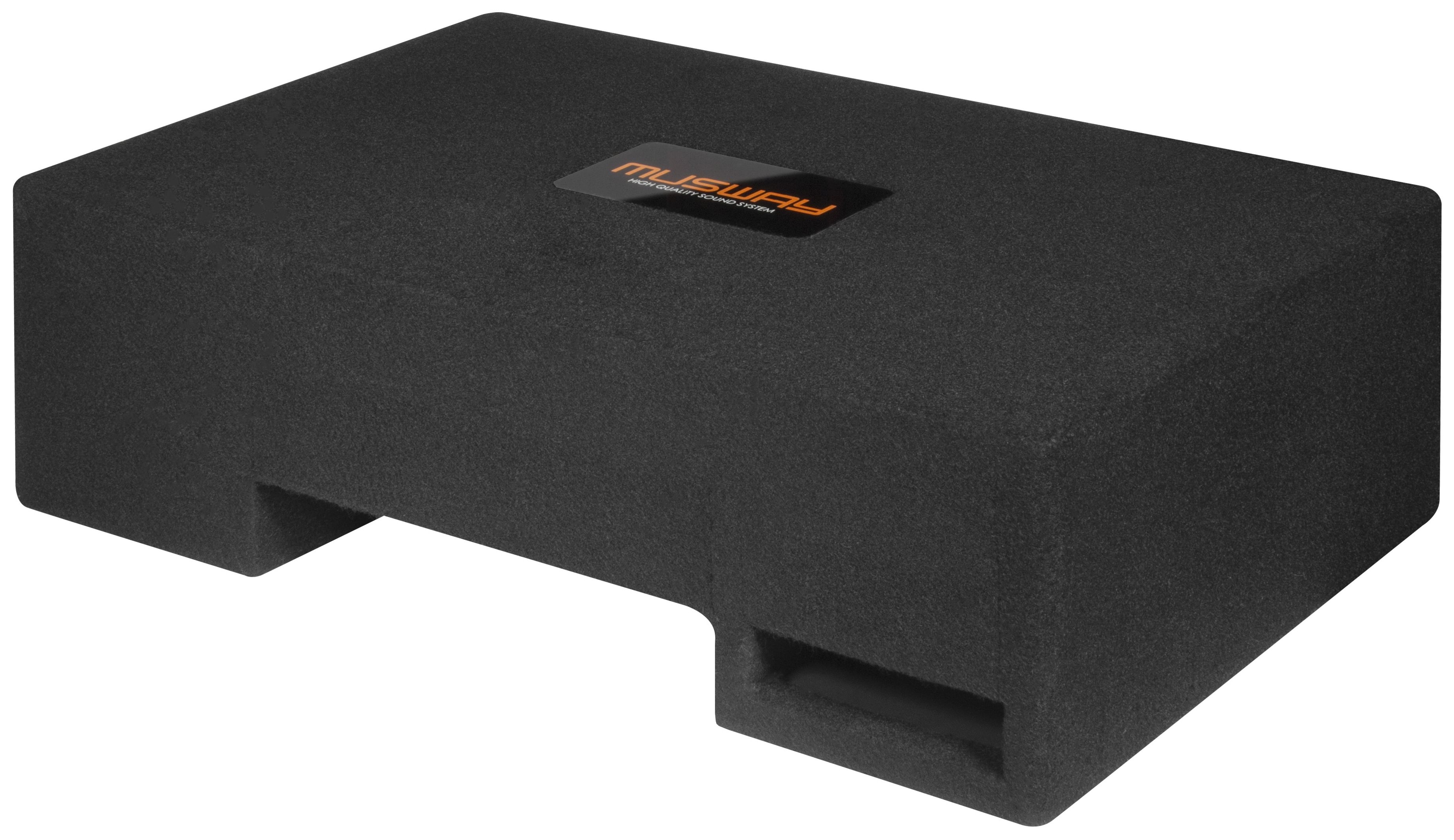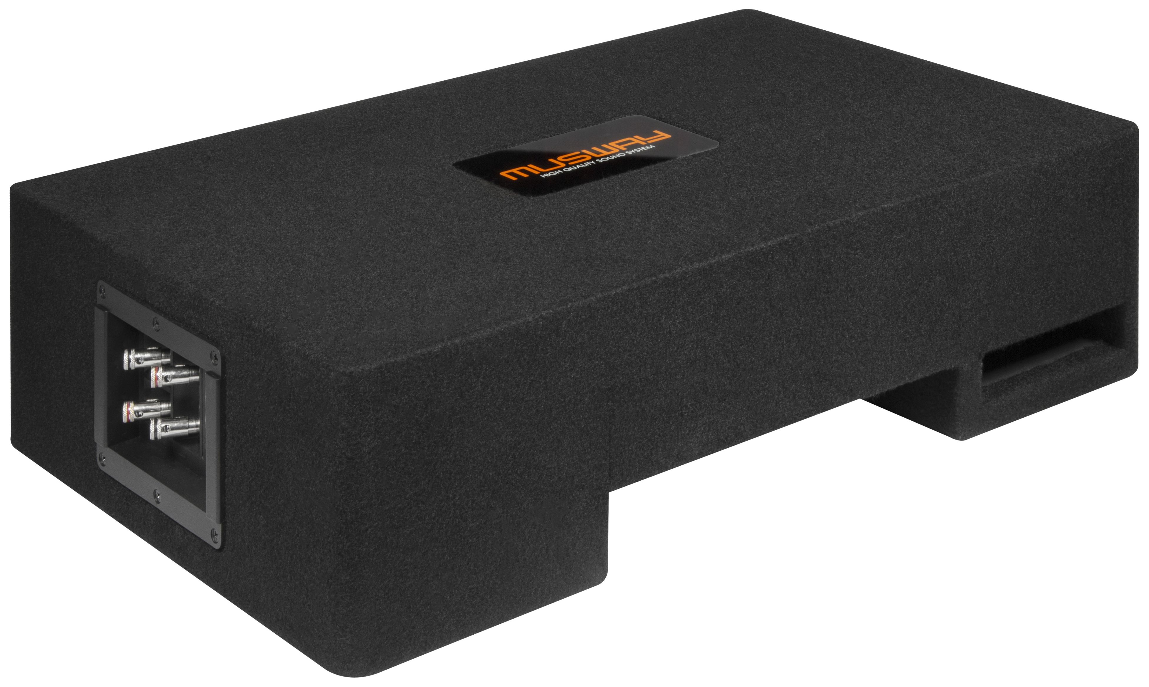 Die stabil konstruierten MDF-Gehäuse sind mit hochwertigem schwarzem Teppich bezogen und fügen sich harmonisch und dezent in jedes Fahrzeuginterieur ein. Weiterhin sind ohne Ausnahme alle Modelle mit Quick Connect Anschlussbuchsen ausgestattet und können blitzschnell per optionalem Anschlusskabel beispielsweise an die MUSWAY M6 und deren Quick Connect Terminal angeschlossen werden. Selbstverständlich können die MUSWAY Subwoofer-Systeme auch konventionell an herkömmliche Push-Pin Terminals angeschlossen werden.