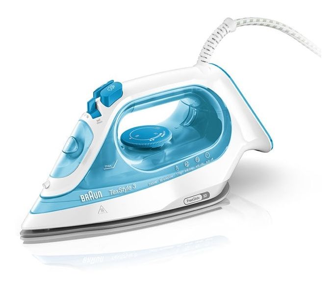 Braun TexStyle 3 Steam Iron SI 3053 Blue. Material Bügelsohle: Keramik-Bügelsohle, Kabellänge: 2 m, Dampfstoßleistung: 170 g/min. Bügeleisen-Wattleistung: 2400 W