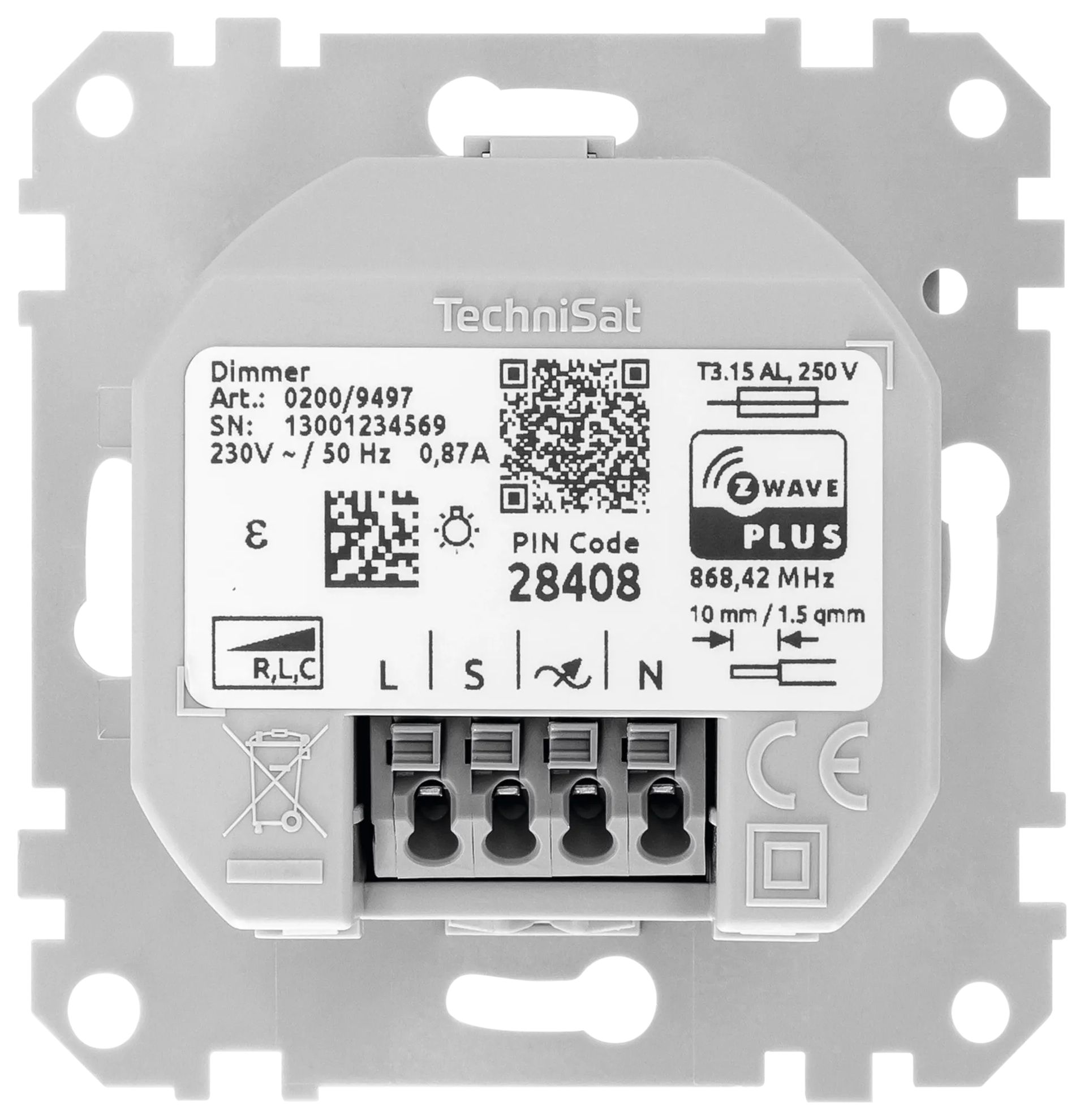 Der TechniSat Dimmer regelt die Helligkeit, z. B. einer Deckenlampe, über die Wippen. Gleichzeitig ist die Integration in ein Z-Wave-Smart-Home-System möglich, um effektvolle Lichtakzente zu setzen oder ein spezielles Lichtambiente zu erzeugen. Des Weiteren kann der Stromverbrauch ermittelt oder der Dimmer in komplexe Smart-Home-Szenen eingebunden werden. Der Dimmer wird in handelsüblichen Unterputz-Dosen (DIN 49073-1) installiert.