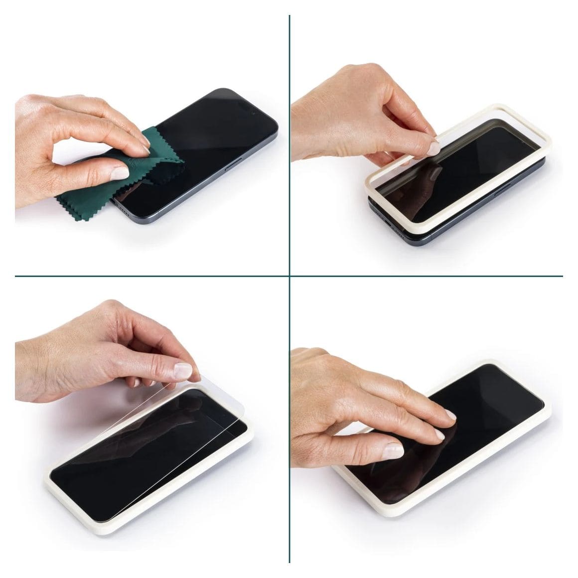 In drei einfachen Schritten zum Displayschutz: Handy-Display reinigen, EcoFrame Montagehilfe auf das Display, Handy-Schutzglas drauf - fertig