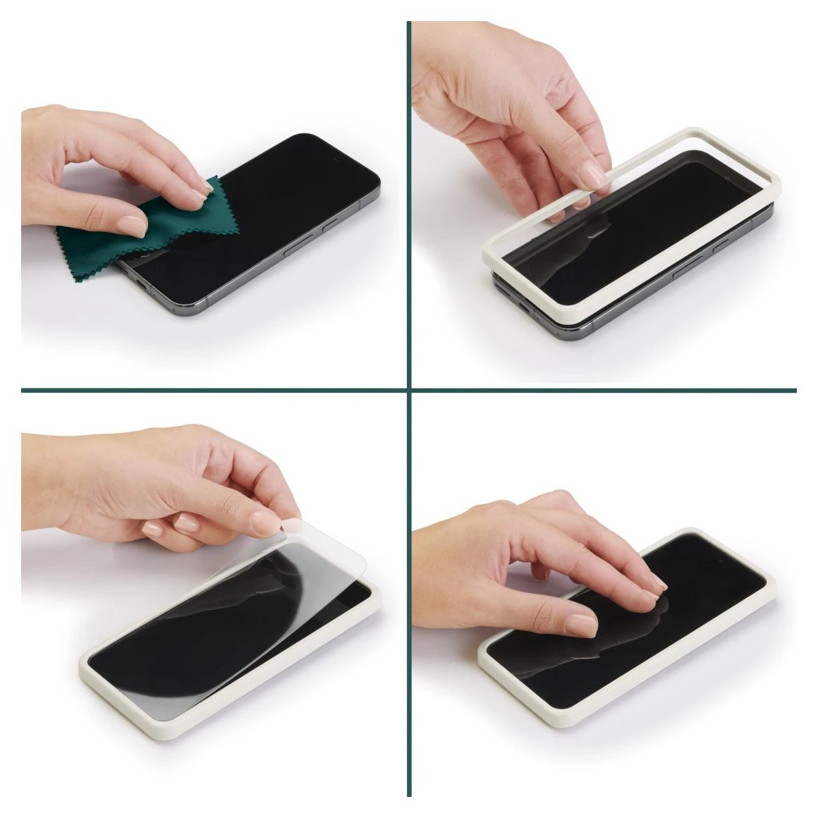 In drei einfachen Schritten zum Displayschutz: Handy-Display reinigen, EcoFrame Montagehilfe auf das Display, Handy-Schutzglas drauf - fertig