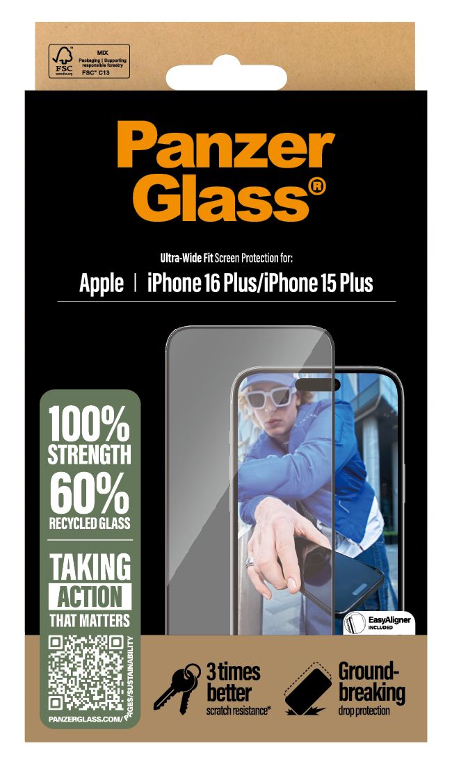 Dieser Displayschutz verlängert die Lebensdauer deines Handys, damit du es eines Tages an eine andere Person weitergeben kannst, die es genauso liebt wie du. Es ist der neue Lebenszyklus deines Handys und eine Möglichkeit, auf eine nachhaltigere Zukunft hinzuarbeiten. Eine andere ist, weniger Verpackung zu verwenden: Im Jahr 2024 haben wir die Papiermenge in den Verpackungen unserer PanzerGlass® Kernprodukte um durchschnittlich 66%* reduziert. Und wie alle unsere Produkte wird auch dieses in einer Verpackung aus recycelbarem FSC®-zertifiziertem Papier geliefert.
