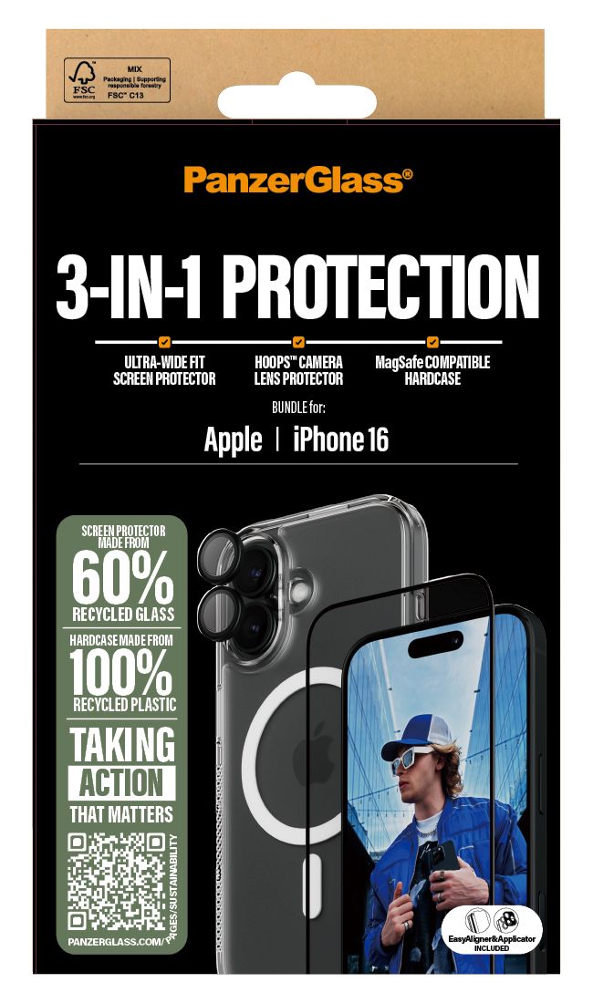 Das 4-in-1-Schutzpaket verlängert die Lebensdauer deines Handys, damit du es eines Tages an eine andere Person weitergeben kannst, die es genauso liebt wie du. Das ist der neue Lebenszyklus deines Handys und eine Möglichkeit, auf eine nachhaltigere Zukunft hinzuarbeiten. Eine andere ist, weniger Verpackung zu verwenden: Im Jahr 2024 haben wir die Papiermenge in den Verpackungen unserer Kernprodukte von PanzerGlass® um durchschnittlich 66 %* reduziert. Und natürlich liefern wir alle unsere Produkte weiterhin in recycelbaren FSC®-zertifizierten Verpackungen aus.