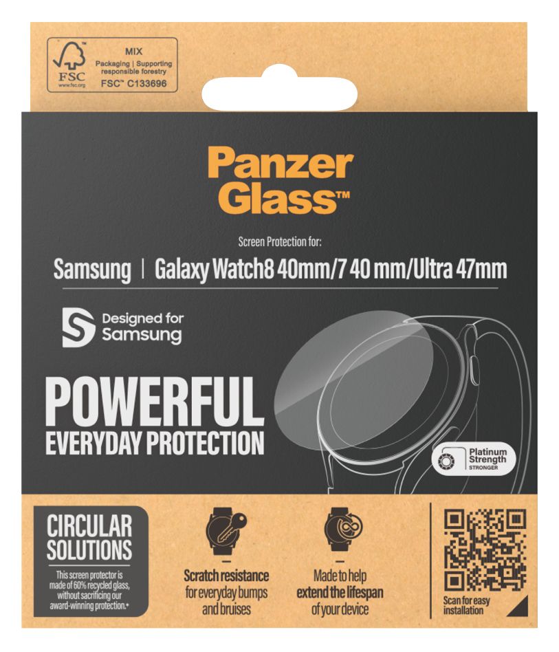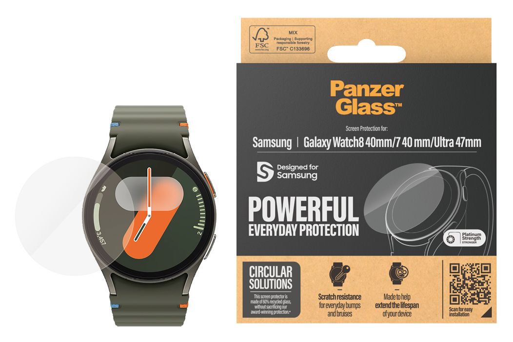 PanzerGlass ® Displayschutz Samsung Galaxy Watch8 40mm | Watch Ultra 47mm | Watch7 40mm. Markenkompatibilität: Samsung, Kompatibilität: Samsung - Galaxy Watch7 40mm, Samsung - Galaxy Watch8 40mm, Samsung - Galaxy Watch Ultra 47mm. Trockene Anwendung. Schutzfunktion: Kratzresistent, Schockresistent. Material: Gehärtetes Glas, Polyethylenterephthalat, Silikon, Produktfarbe: Transparent. Menge pro Packung: 1 Stück(e)