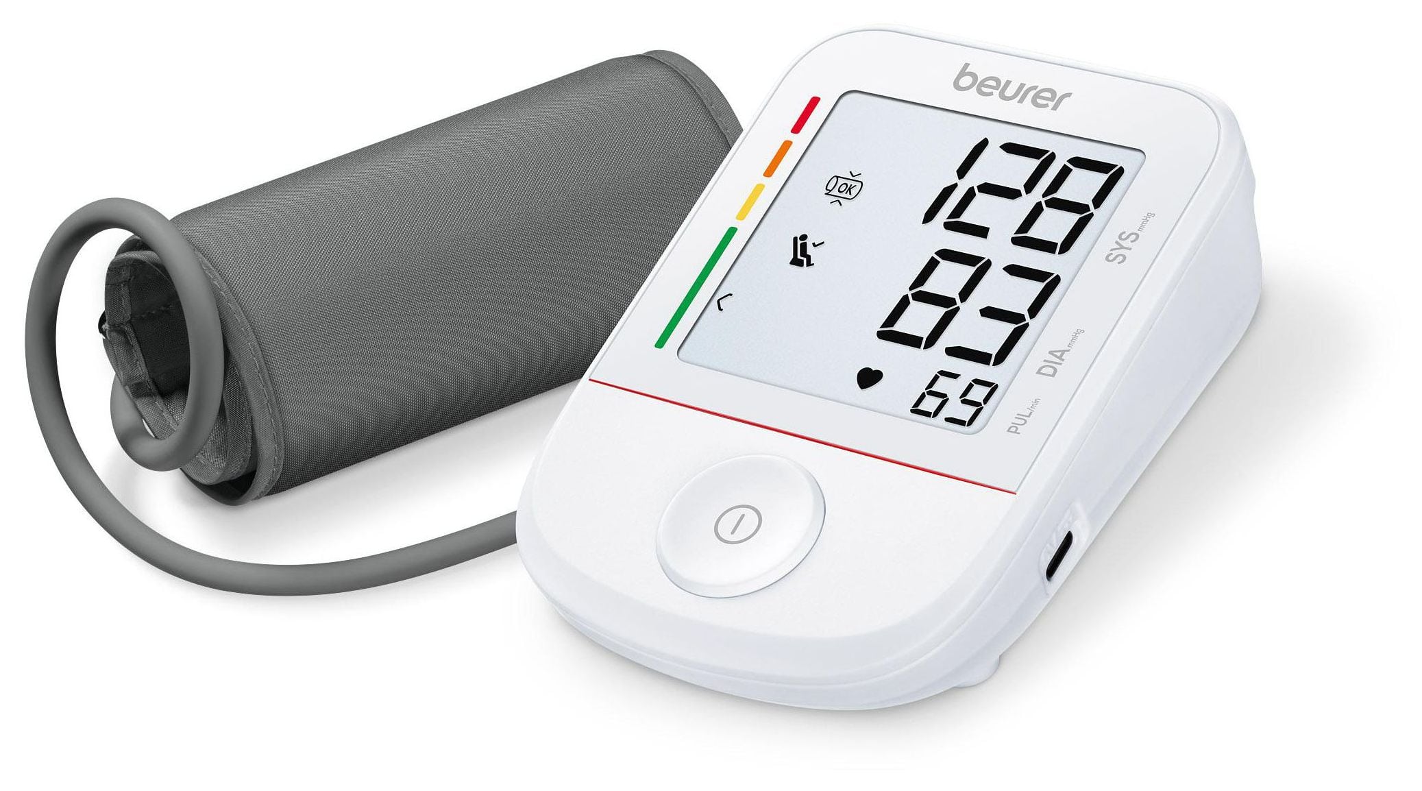 Beurer BM 38. Typ: Automatisch, Produktfarbe: Weiß, Dunkles Grau, Display-Typ: LCD. Display: LCD. Gewicht: 385 g. Ursprungsland: Ungarn. Verpackungsbreite: 120 mm, Verpackungstiefe: 80 mm, Verpackungshöhe: 164 mm
