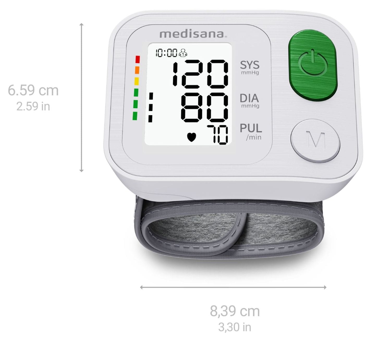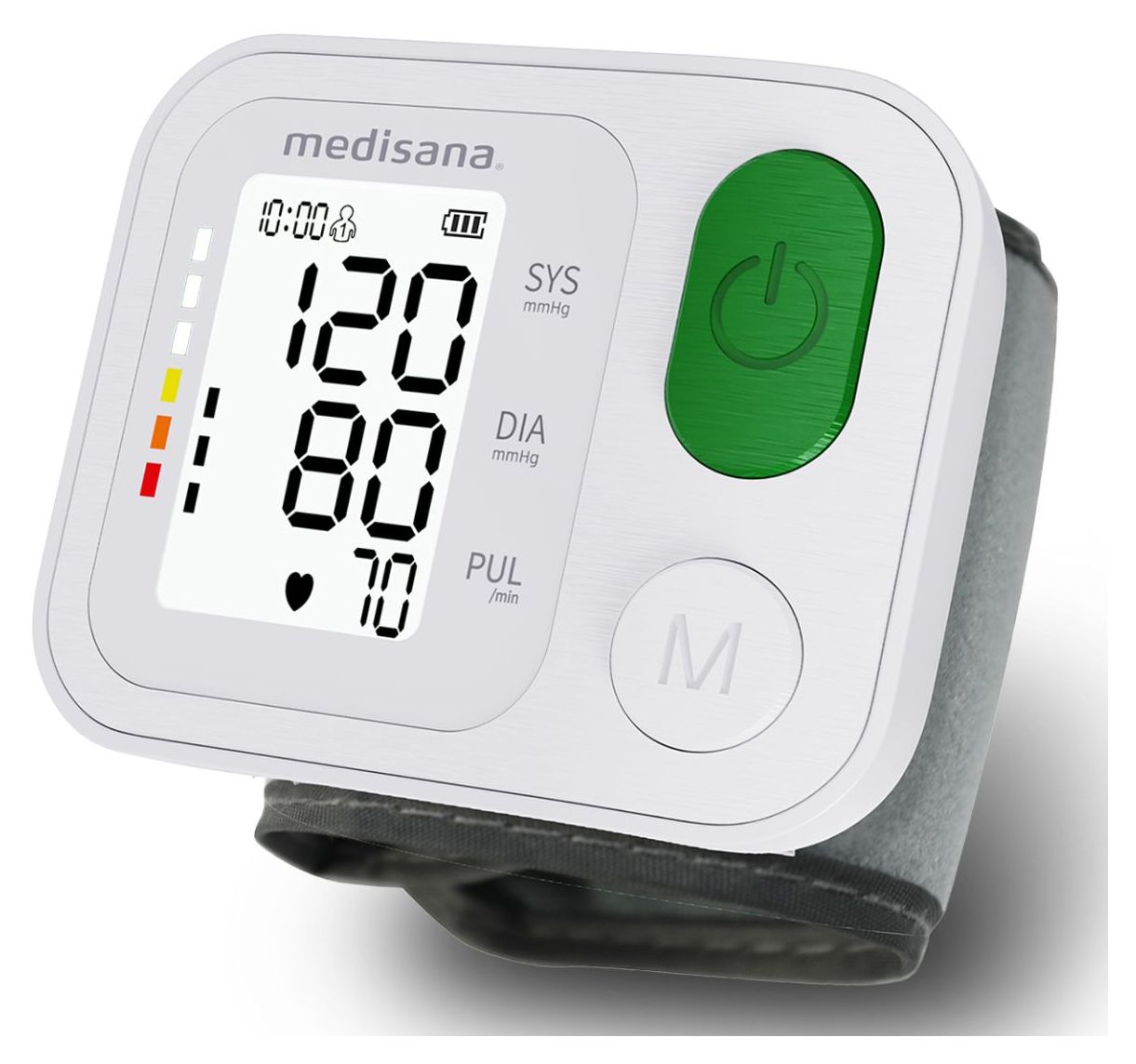 Das Handgelenk-Blutdruckmessgerät BW 345 von medisana bietet eine schnelle, zuverlässige Kontrolle des Blutdrucks und misst präzise direkt am Handgelenk. Die Werte für Systole, Diastole, Puls, Datum und Uhrzeit werden klar und deutlich auf dem beleuchteten LC-Display angezeigt. Dank der integrierten Ampel-Farbskala können die Messergebnisse sofort eingeordnet werden. Einfach, verständlich und auf einen Blick.