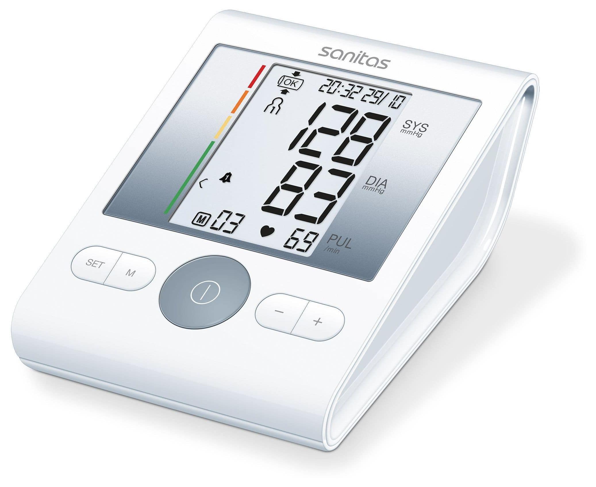 Sanitas 100.64. Unterstützte Positionierung: Oberarm, Typ: Automatisch, Produktfarbe: Weiß. Akku-/Batterietyp: AA, Akku-/Batteriespannung: 1,5 V. Breite: 103 mm, Tiefe: 134 mm, Höhe: 60 mm. Menge pro Packung: 1 Stück(e), Verpackungsbreite: 96 mm, Verpackungstiefe: 130 mm