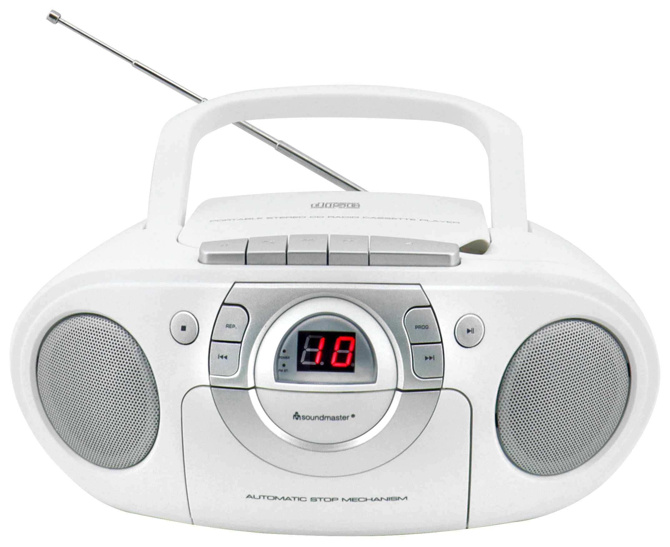 Soundmaster SCD5100WE. Optisches Laufwerk - Typ: Spieler, Unterstützte Medien: CD, CD-R, CD-RW. Produktfarbe: Weiß, Lautstärkeregler: Tasten. Kopfhörer-Anschluss: 3,5 mm. Energiequelle: Wechselstrom/Batterie, AC Eingangsspannung: 230 V, AC Eingangsfrequenz: 50 Hz. Breite: 295 mm, Tiefe: 215 mm, Höhe: 133 mm