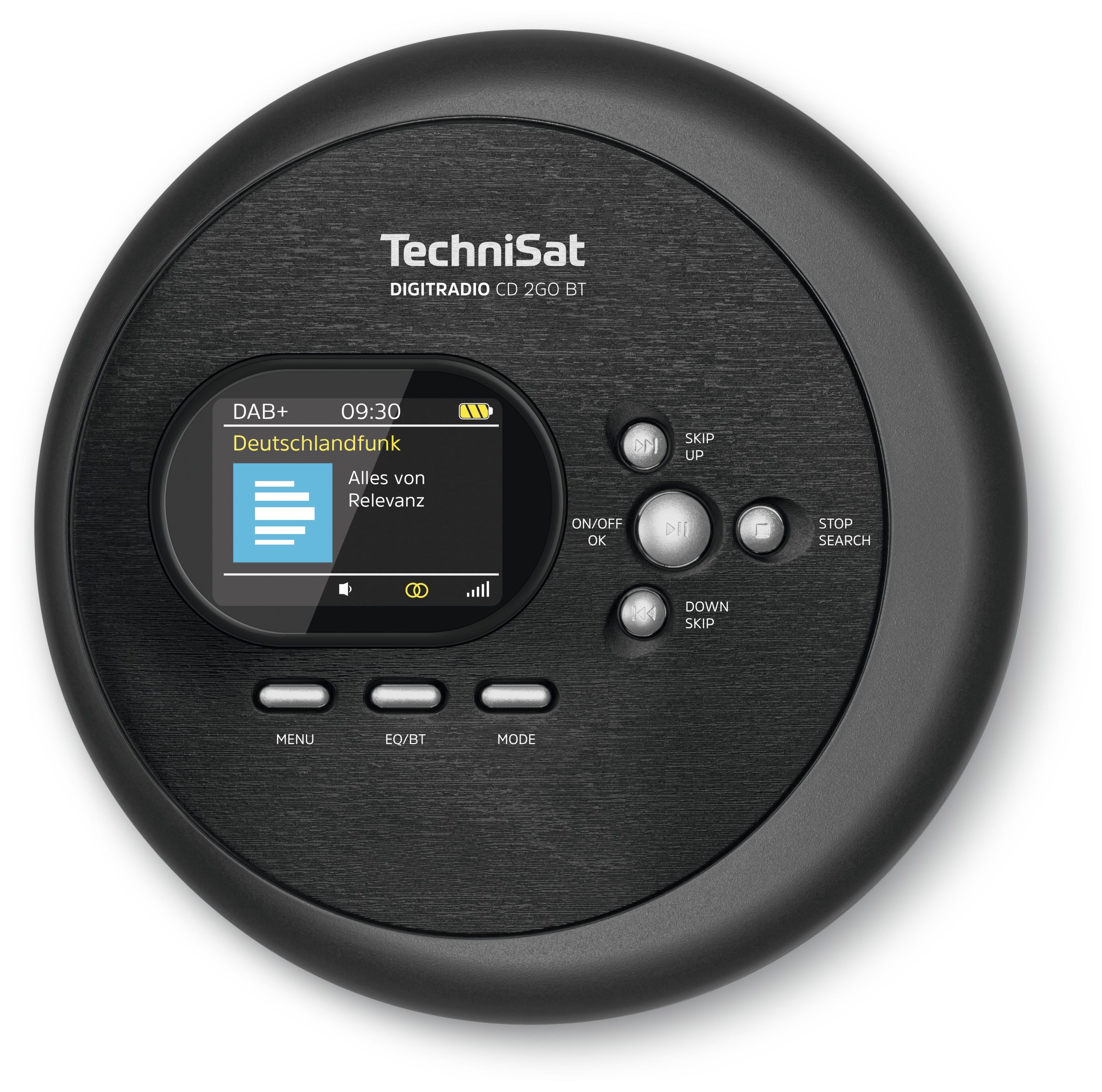 TechniSat DIGITRADIO CD 2GO BT. Unterstützte Audioformate: MP3. Digitales UKW-Radio: 87,5 - 108 MHz, Unterstützte Bänder: DAB+, FM. Gerätetyp: Tragbarer CD-Player, Produktfarbe: Schwarz. Display-Typ: TFT. Kopfhörer-Anschluss: 3,5 mm, Bluetooth-Profile: A2DP, AVRCP, HFP