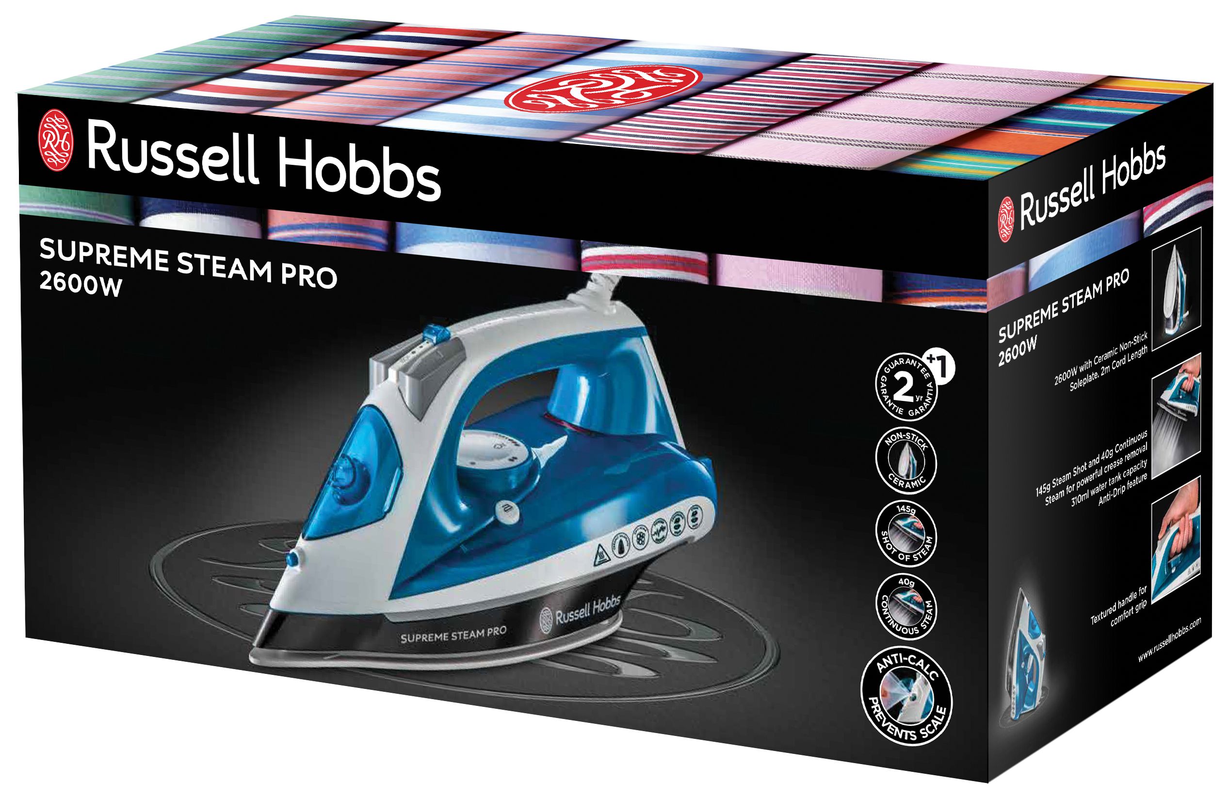 Russell Hobbs Supreme Steam Pro. Bügeleisen-Wattleistung: 2600 W, Dampfstoßleistung: 145 g/min, Material Bügelsohle: Keramik-Bügelsohle. Kabellänge: 2 m. Breite: 310 mm, Tiefe: 130 mm, Höhe: 163 mm. Verpackungsbreite: 309 mm, Verpackungstiefe: 166 mm, Verpackungshöhe: 132 mm