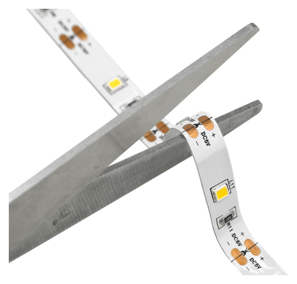 Der doppelseitige Klebestreifen kann bei Bedarf an die Steuereinheit angebracht werden und bietet somit eine flexible Montage. Zusätzlich kann das zwei Meter lange LED Band an den jeweiligen Markierungen beliebig gekürzt und somit passend, z.B. in einen Schrank, montiert werden.