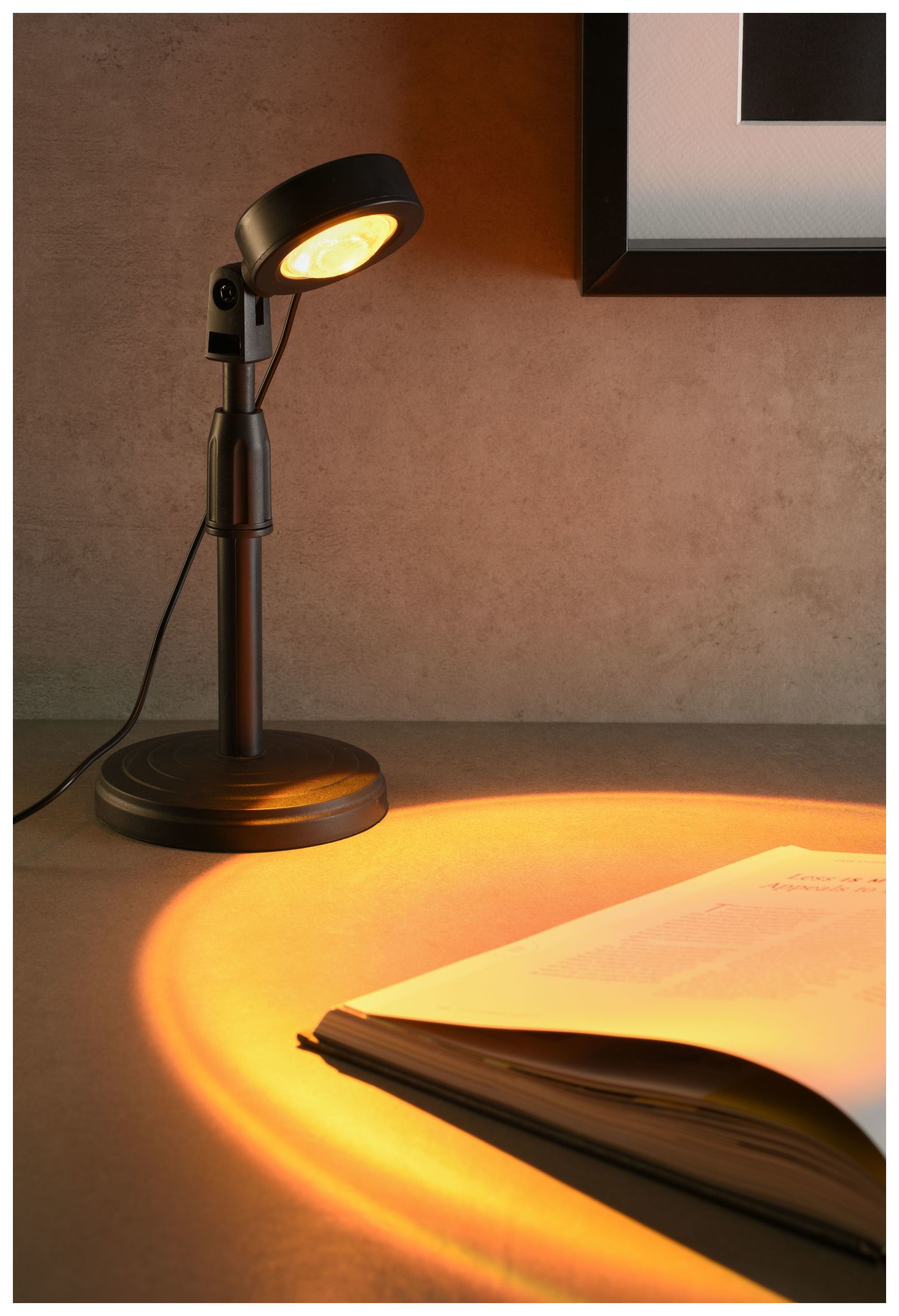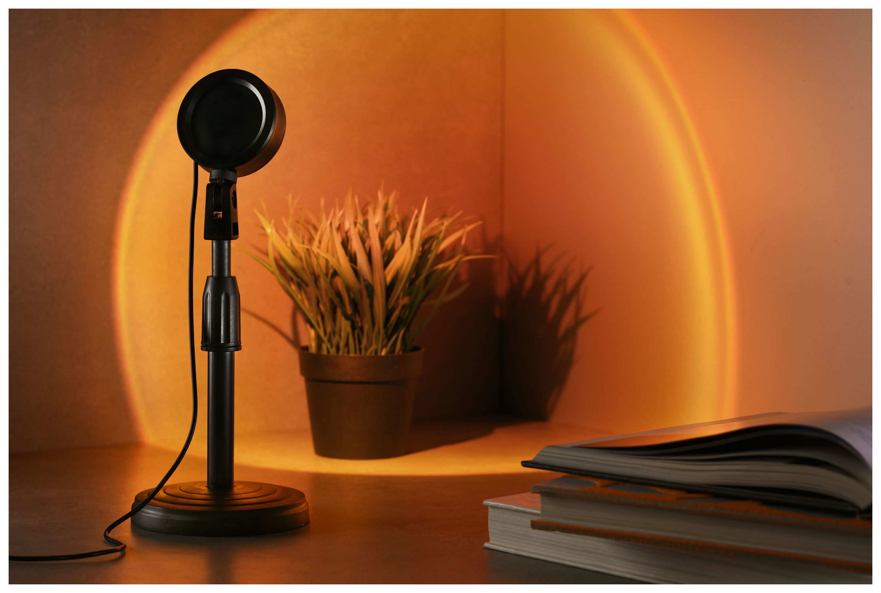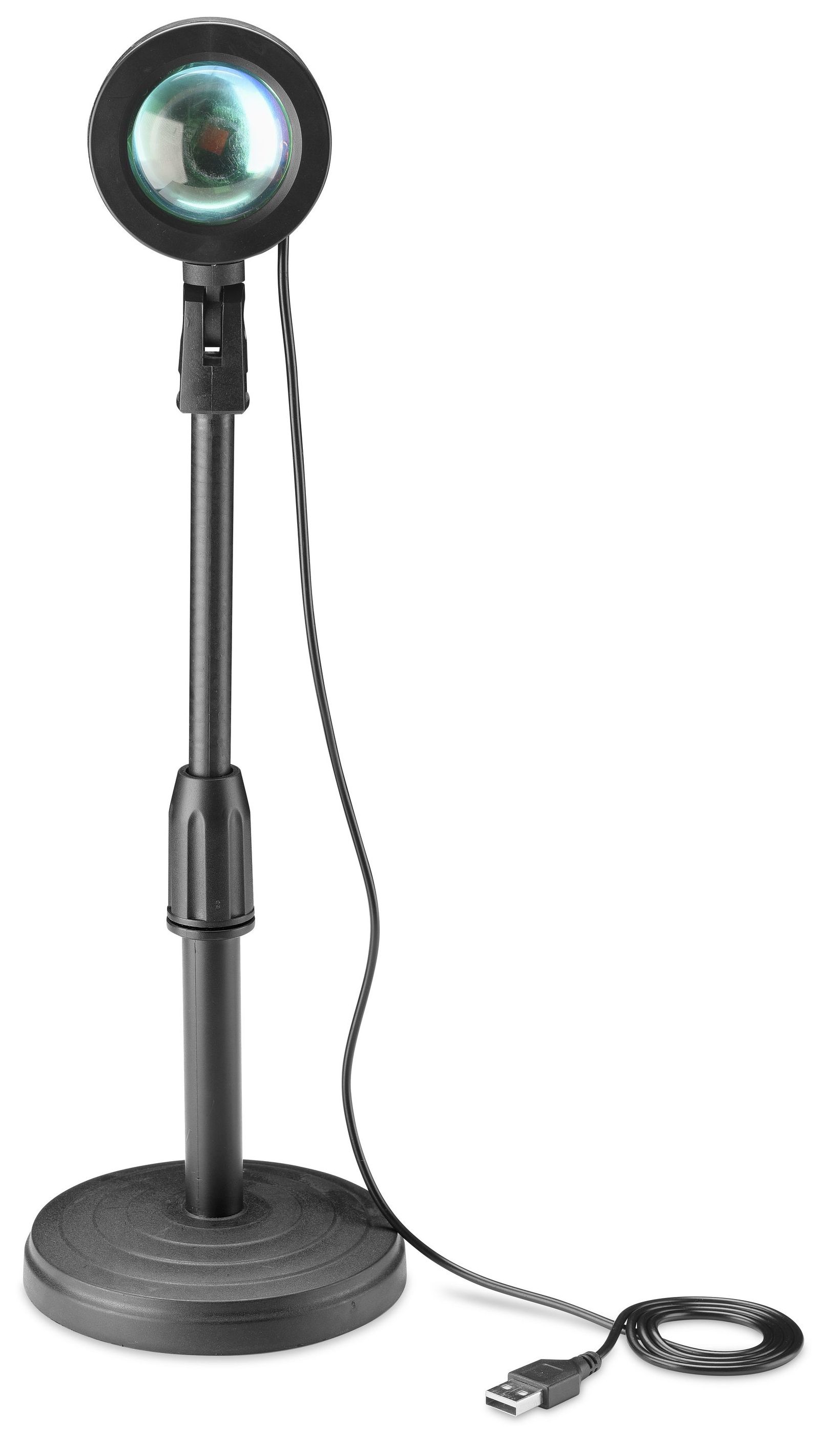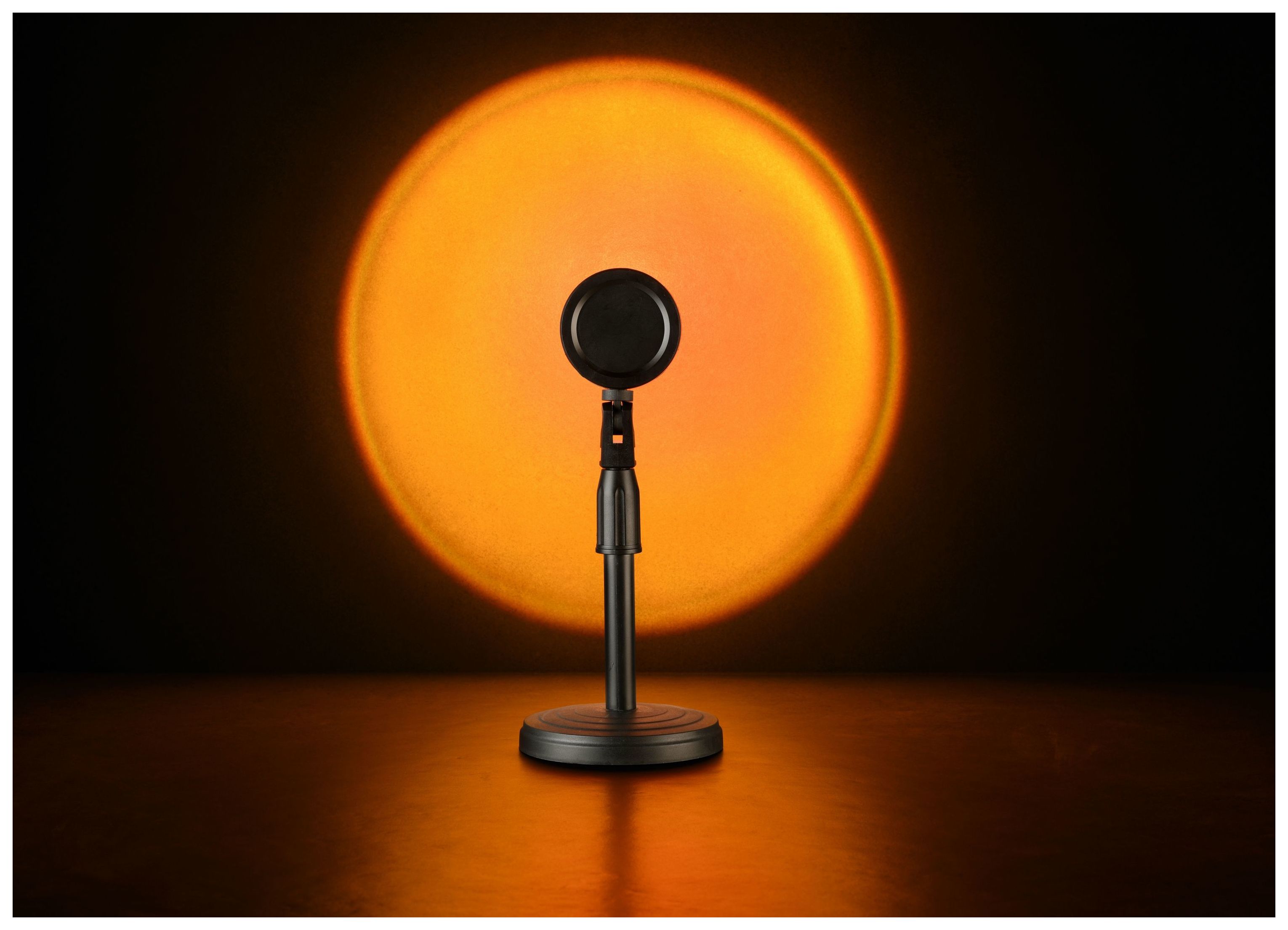 SUNSET LAMP ist eine Stimmungsleuchte, die ein oranges Licht auf Flächen projiziert, das einen Sonnenuntergangs-Effekt erzeugt.Der Kopf der Leuchte ist neigbar und lässt sich um 180° drehen, um das Sonnenuntergangslicht einstellen zu können.Das Stativ auf dem es ruht ist bis auf maximal 36cm höhenverstellbar.Die Leuchte wird über ein Kabel mit USB-A Stecker gespeist.