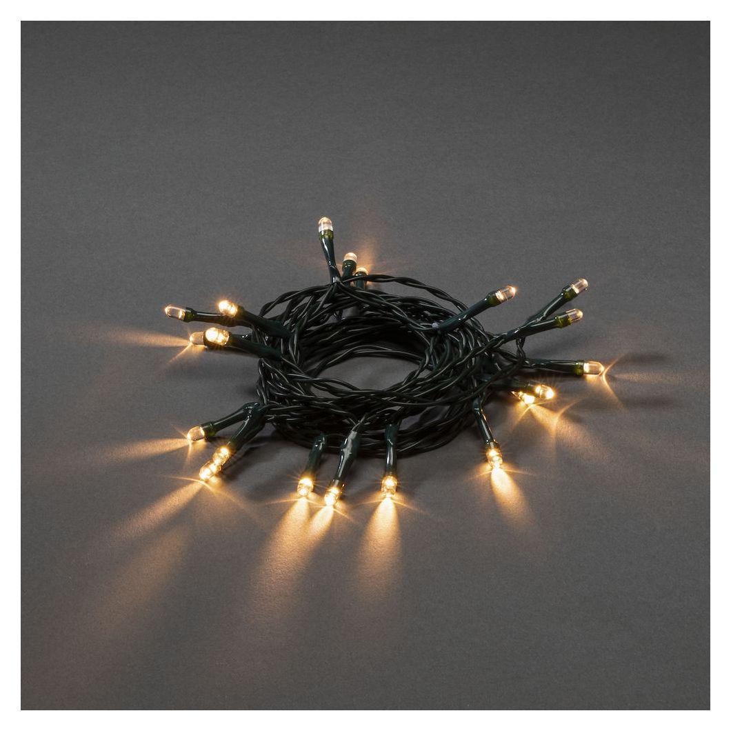 Konstsmide 1408-100. Produkttyp: Leichte Dekorationskette, Produktfarbe: Grün, Gehäusematerial: Kunststoff, Polyvinylchlorid (PVC). Anzahl an Lampen: 20 Glühbirne(n), Leuchtmitteltyp: LED, Gesamtleistung: 0,4 W. Energiequelle: Akku, Akku-/Batterietyp: AA, Akku-/Batterietechnologie: Alkali. Länge (mm): 2850 mm, Kabellänge: 0,5 m, Leuchtmittel-Abstand: 15 cm. Menge pro Packung: 1 Stück(e)