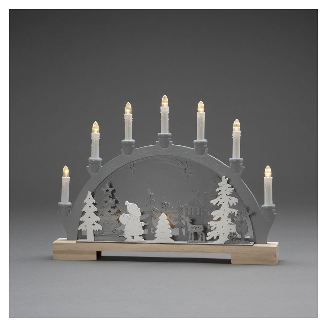 Konstsmide LED Holzsilh. Produkttyp: Leichte Dekorationsfigur, Produktfarbe: Grau, Weiß, Gehäusematerial: Holz. Anzahl an Lampen: 10 Glühbirne(n), Leuchtmitteltyp: LED, Gesamtleistung: 0,6 W. Energiequelle: Akku, Arbeitsspannung: 1,5 V, Akku-/Batterietyp: AA. Höhe: 330 mm, Breite: 450 mm, Tiefe: 50 mm. Menge pro Packung: 1 Stück(e)