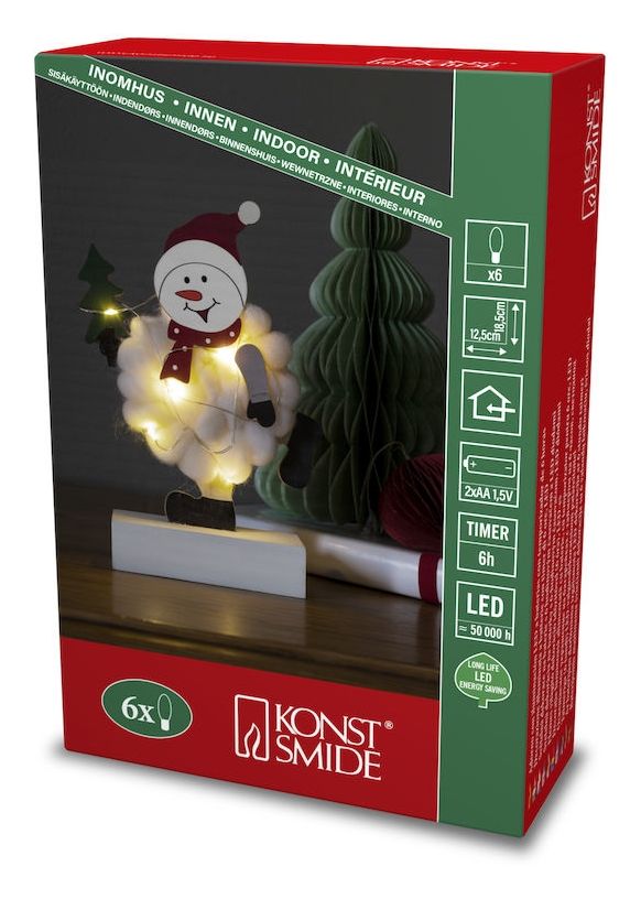 Konstsmide Wood/Cotton Snowman. Produkttyp: Leichte Dekorationsfigur, Produktfarbe: Weiß, Gehäusematerial: Baumwolle, Holz. Anzahl an Lampen: 6 Glühbirne(n), Leuchtmitteltyp: LED, Gesamtleistung: 0,36 W. Energiequelle: Akku, Eingangsspannung: 1.5 V, Akku-/Batterietyp: AA. Höhe: 185 mm, Breite: 125 mm, Tiefe: 45 mm. Menge pro Packung: 1 Stück(e)