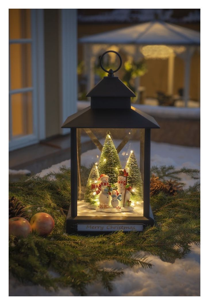 Konstsmide Laterne, gross, Schneemaenner. Produktfarbe: Schwarz, Internationale Schutzart (IP-Code): IP44, Material: Kunststoff. Lampentyp: LED, Lampenleistung: 4,6 W, Farbtemperatur: 3000 K. Energiequelle: AC, Akku, Akku-/Batterietyp: LR14, Akku-/Batterietechnologie: Alkali. Breite: 245 mm, Tiefe: 245 mm, Höhe: 42 mm