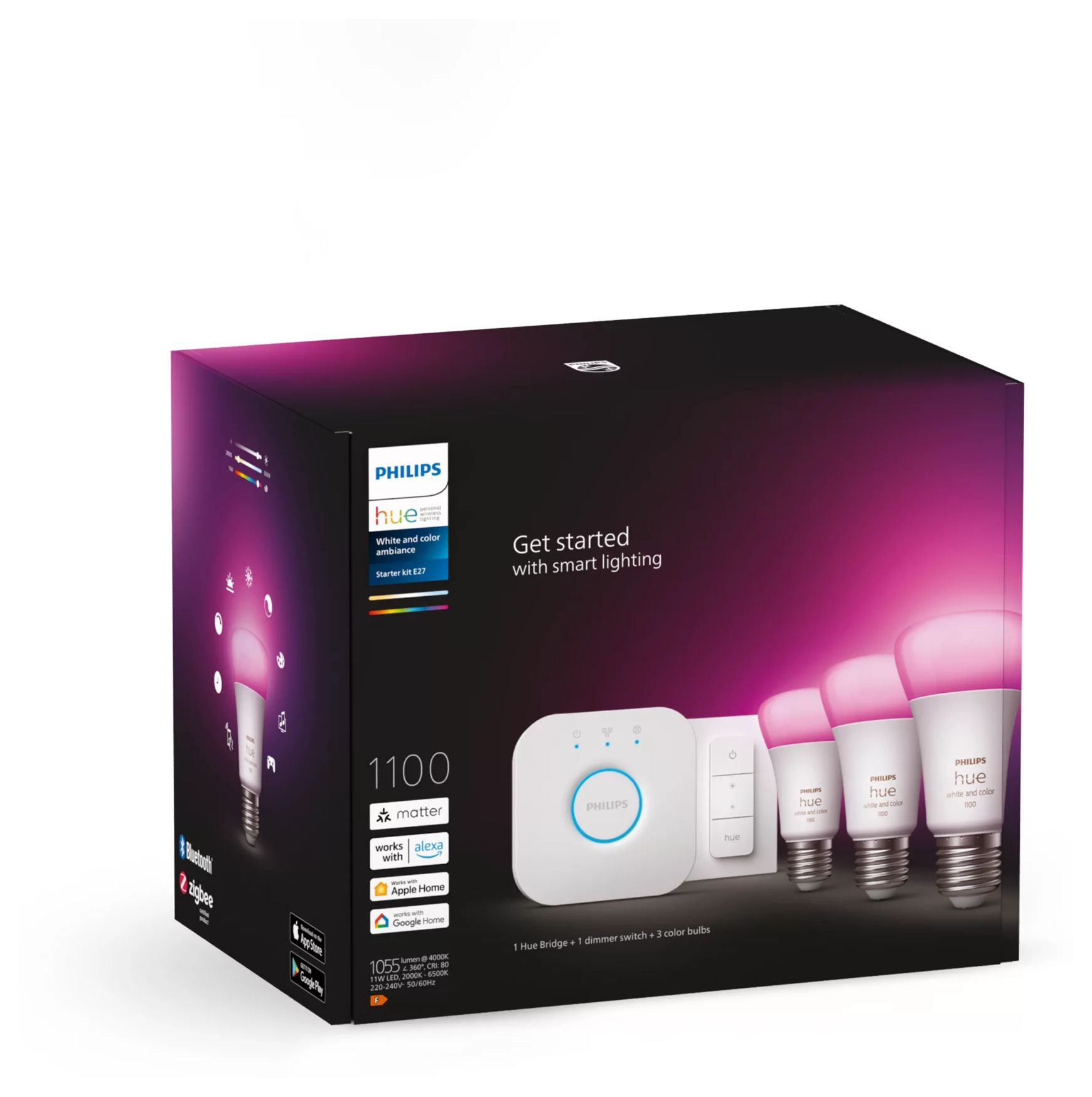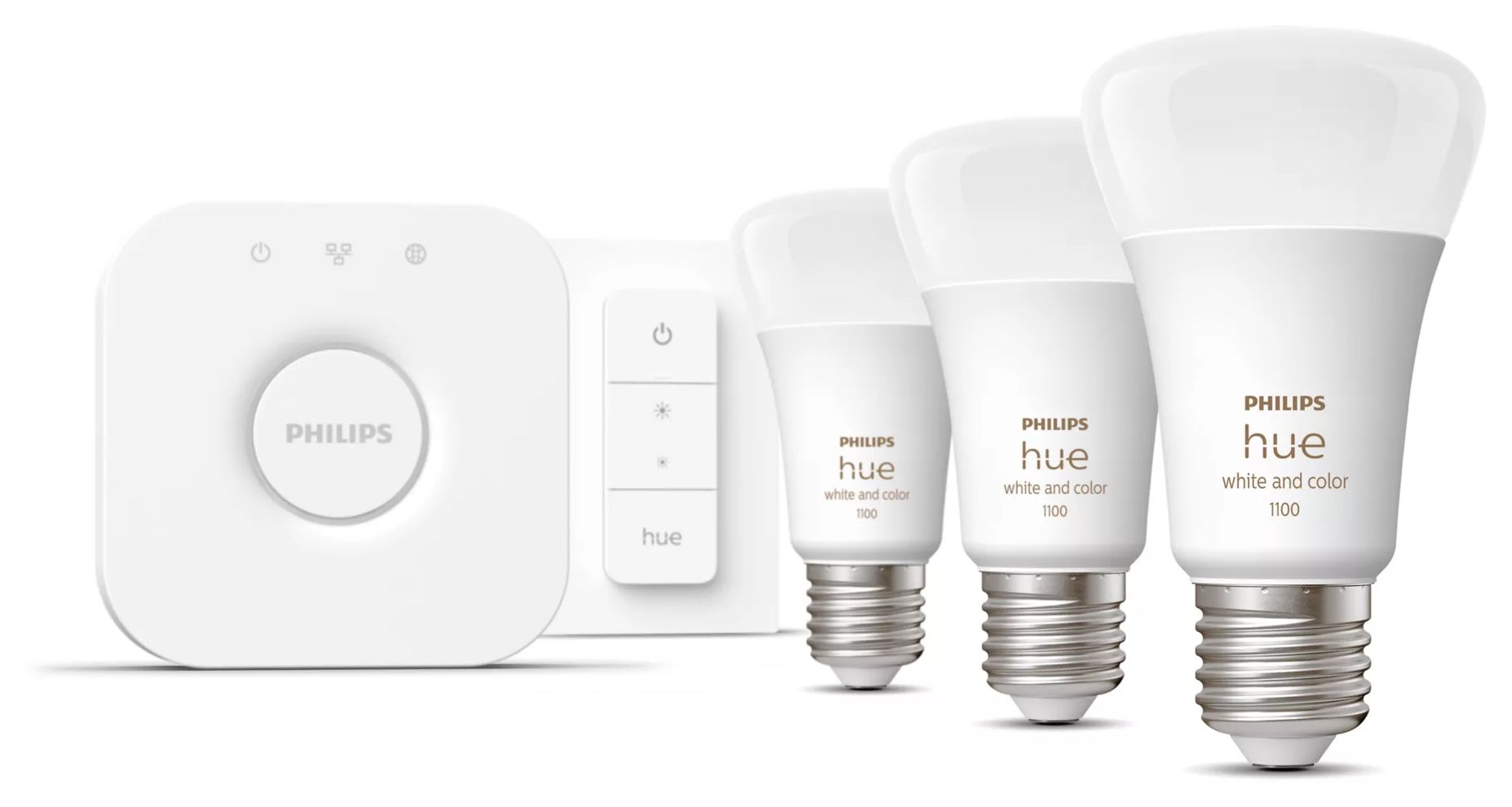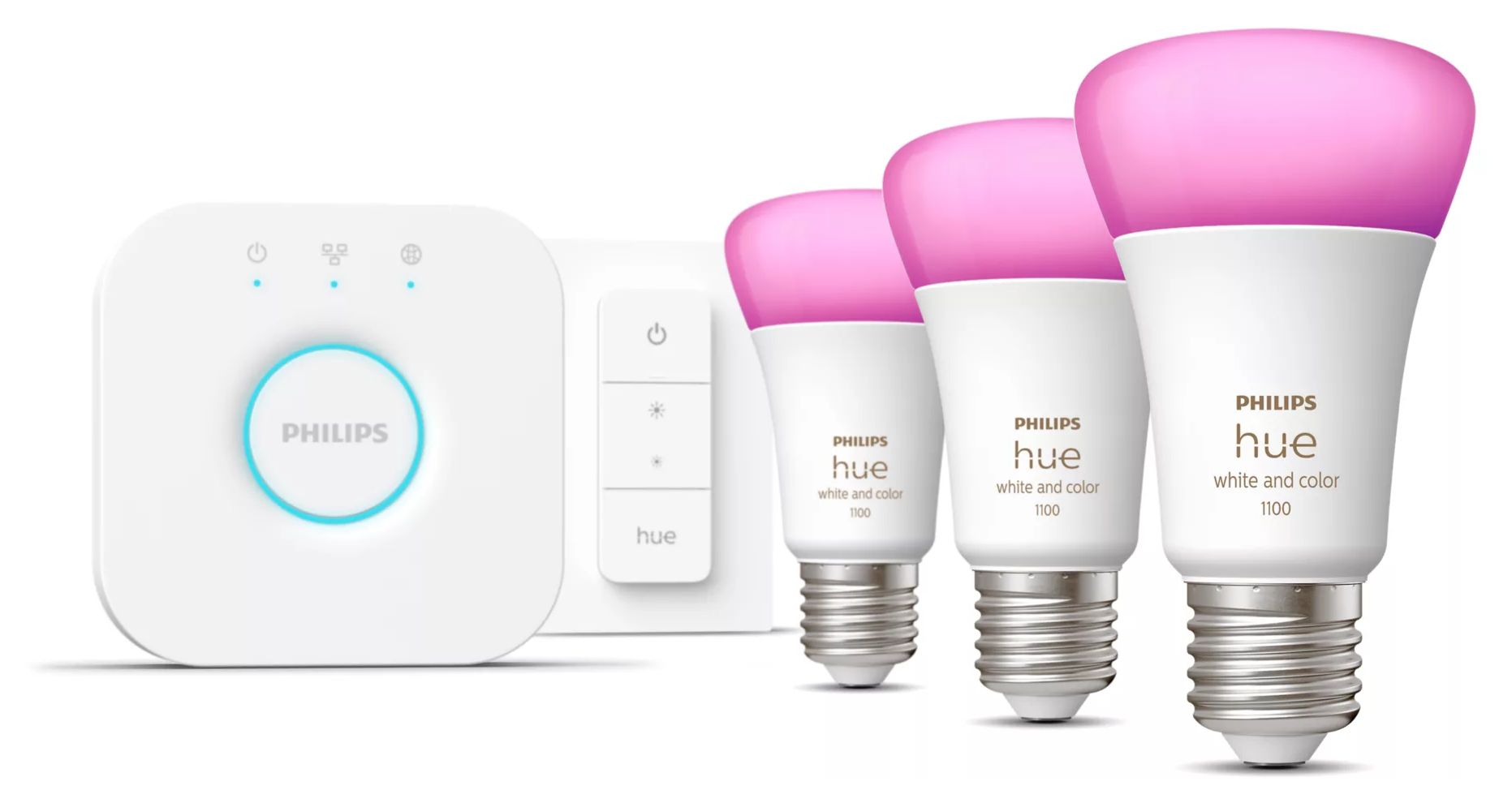 Hue White and Color Ambiance Starterset 3xE27 + Bridge + 1 Dimmschalter LED Set für intelligente Beleuchtung