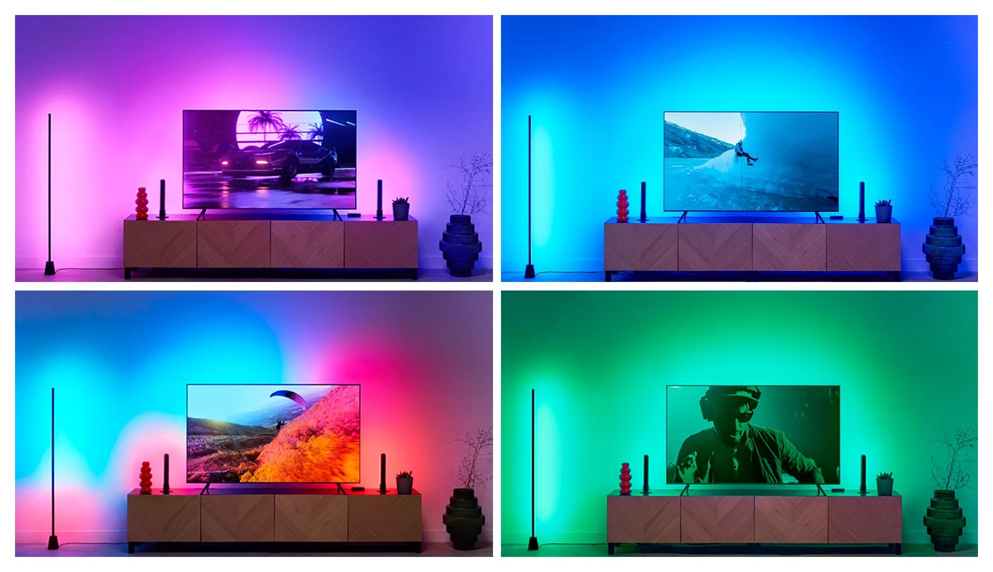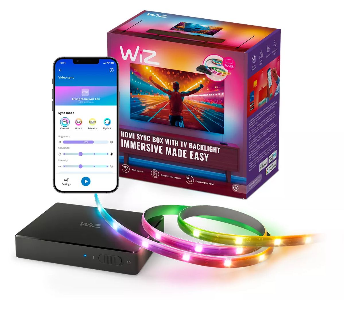 Sorge für mehr Unterhaltung, indem Du die Farben Deines Fernsehers in Echtzeit projizierst. Der RGBIC Strip sorgt für leuchtende Farben und schnelle Beleuchtung bei Filmen, Spielen oder Musik. Genieße die einfache Installation und die genaue Farbanpassung über HDMI. Synchronisiere Dich mit jedem HDMI 2.0-Gerät wie einem Streaming Stick oder einer Spielkonsole. Verbinde beliebig viele farbfähige WiZ-Lichter über WLAN und beleuchte den ganzen Raum.