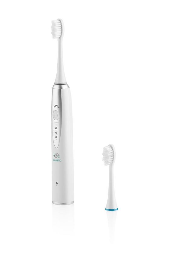 Eta Sonetic 070790000. Zahnbürstentyp: Schallzahnbürste, Zahnbürsten Modi: Massage, Puls, Weich, Produktfarbe: Edelstahl, Weiß. Energiequelle: Akku, Akku-/Batterietyp: Integrierte Batterie, Akku-/Batterietechnologie: Lithium-Ion (Li-Ion). Anzahl enthaltener Griffe: 1 Stück(e), Anzahl enthaltener Bürstenköpfe: 2 Stück(e), Anzahl enthaltener Akkus/Batterien: 1 Stück(e)