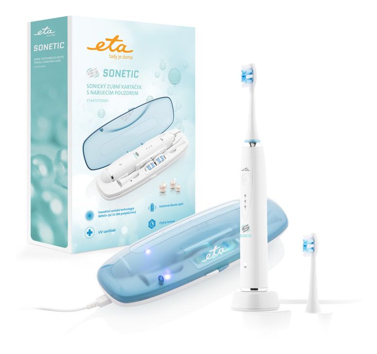 Eta ETA470790000. Zweck: Erwachsener, Zahnbürstentyp: Schallzahnbürste, Produktfarbe: Weiß. Energiequelle: Akku, Akku-/Batterietyp: Integrierte Batterie, Akku-/Batterietechnologie: Lithium-Ion (Li-Ion). Anzahl enthaltener Griffe: 1 Stück(e), Anzahl enthaltener Bürstenköpfe: 2 Stück(e)