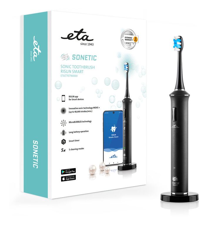 Eta ETA770790000. Zweck: Erwachsener, Zahnbürstentyp: Schallzahnbürste, Zahnbürsten Modi: Intensiv, Massage, Sensibel, Whitening. Energiequelle: Akku, Akku-/Batterietyp: Integrierte Batterie, Akku-/Batterietechnologie: Lithium-Ion (Li-Ion). Anzahl enthaltener Griffe: 1 Stück(e), Anzahl enthaltener Bürstenköpfe: 3 Stück(e)