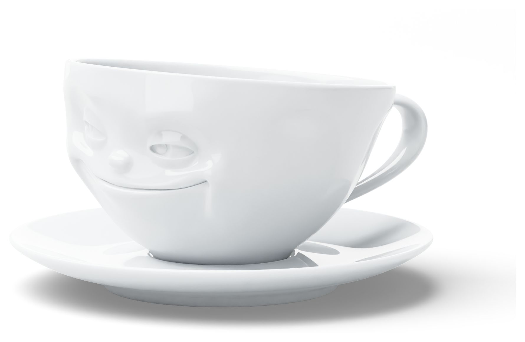 Mit Henkel und Unterteller für eine große Tasse Kaffee, Tee oder Kakao. Wird in einer schönen Geschenkbox geliefert. Sollte mal was kaputt gehen: Ersatz Unterteller können auch einzeln nachbestellt werden.