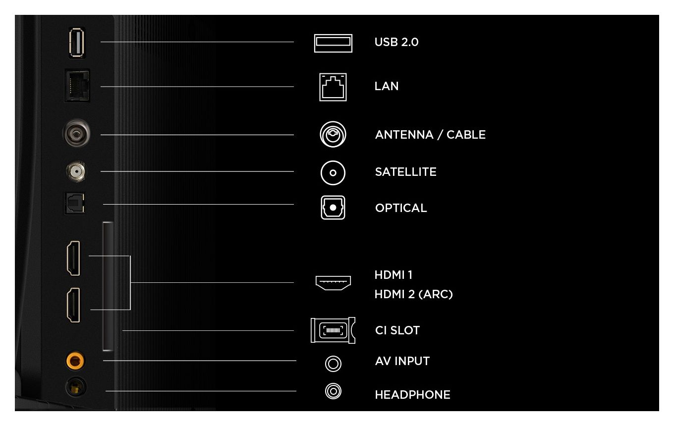 - WLAN: Integriertes WLAN – Kabellose Verbindung für Smart-TV-Funktionen.