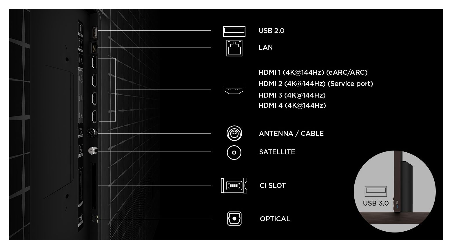 - WLAN: Integriertes WLAN – Kabellose Verbindung für Smart-TV-Funktionen.