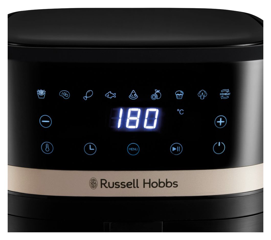 Die 4,3L Russell Hobbs SatisFry Heißluftfritteuse macht die Zubereitung von Mahlzeiten zum Kinderspiel – egal, ob du die Reste vom Vortag aufwärmst oder frisches, knuspriges Hühnchen zauberst. Und auf deiner Arbeitsplatte macht sie ebenfalls eine großartige Figur: Champagner-Akzente verleihen dem klassischen schwarzen Gehäuse einen modernen Touch, der sich perfekt in jede Küchengestaltung einfügt.