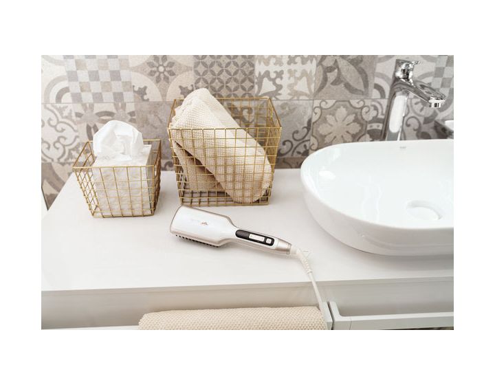Eta Fenité. Typ: Glättbürste, Technologie: Warm, Steuerung: Tasten. Produktfarbe: Weiß, Hängeart: Hängeschlaufe. Kabellänge: 1,8 m, Display-Typ: LED, Automatische Abschaltung nach: 60 min. Energiequelle: AC, Stromverbrauch (Standardbetrieb): 50 W. Kabelfarbe: Weiß