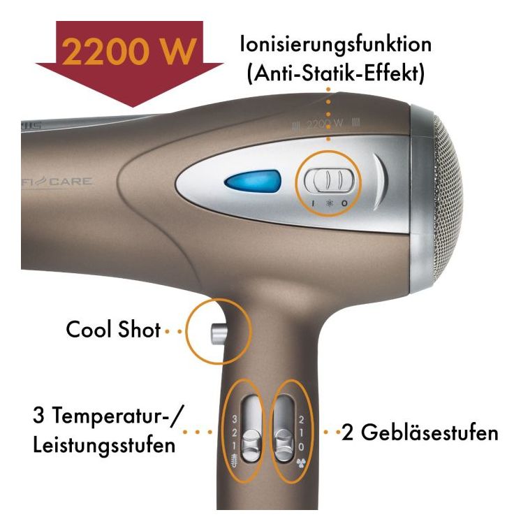 2200 W, 3 Temperatur-/Leistungsstufen, 2 Gebläsestufen, 230 V, 50/60 Hz