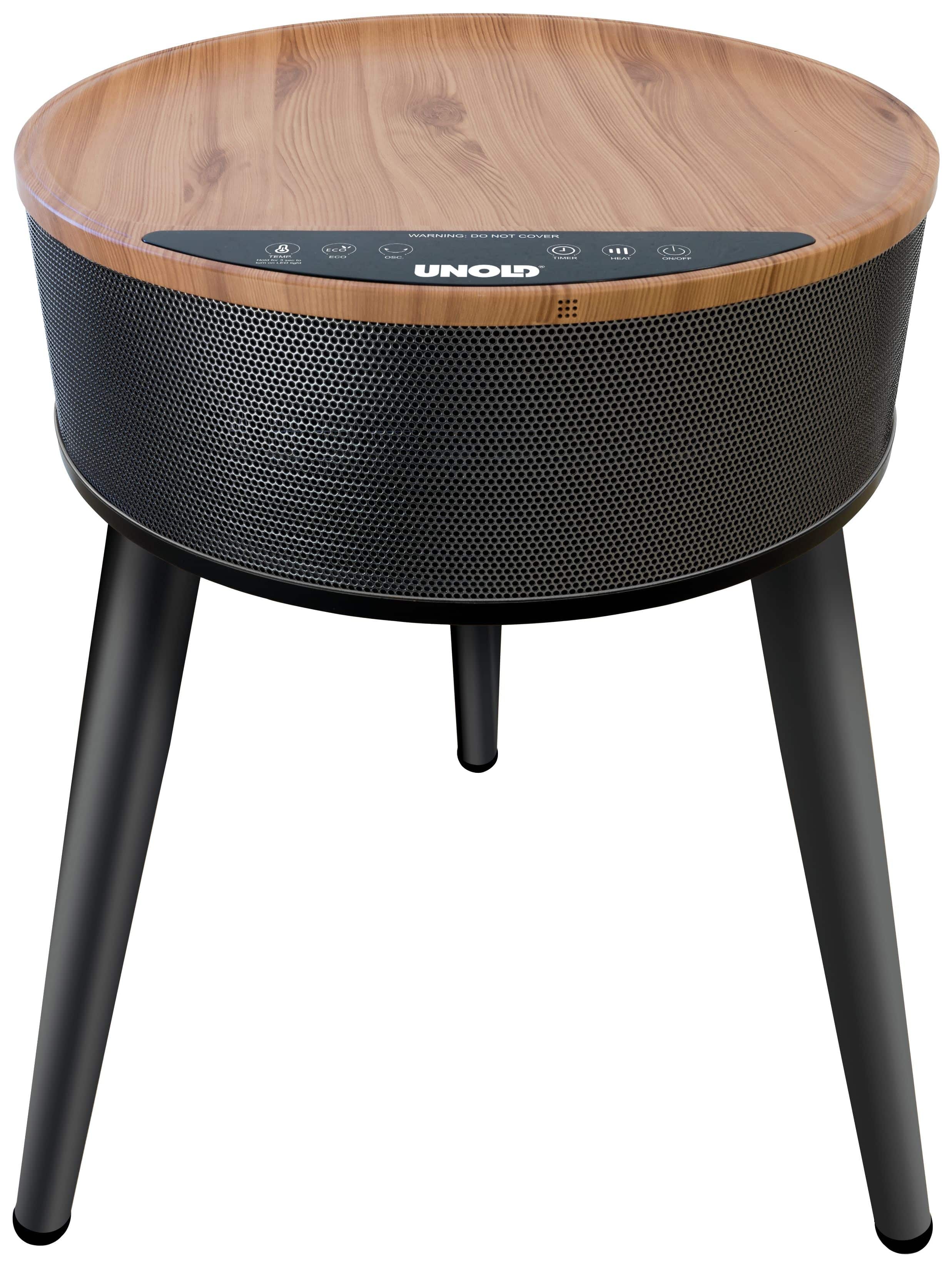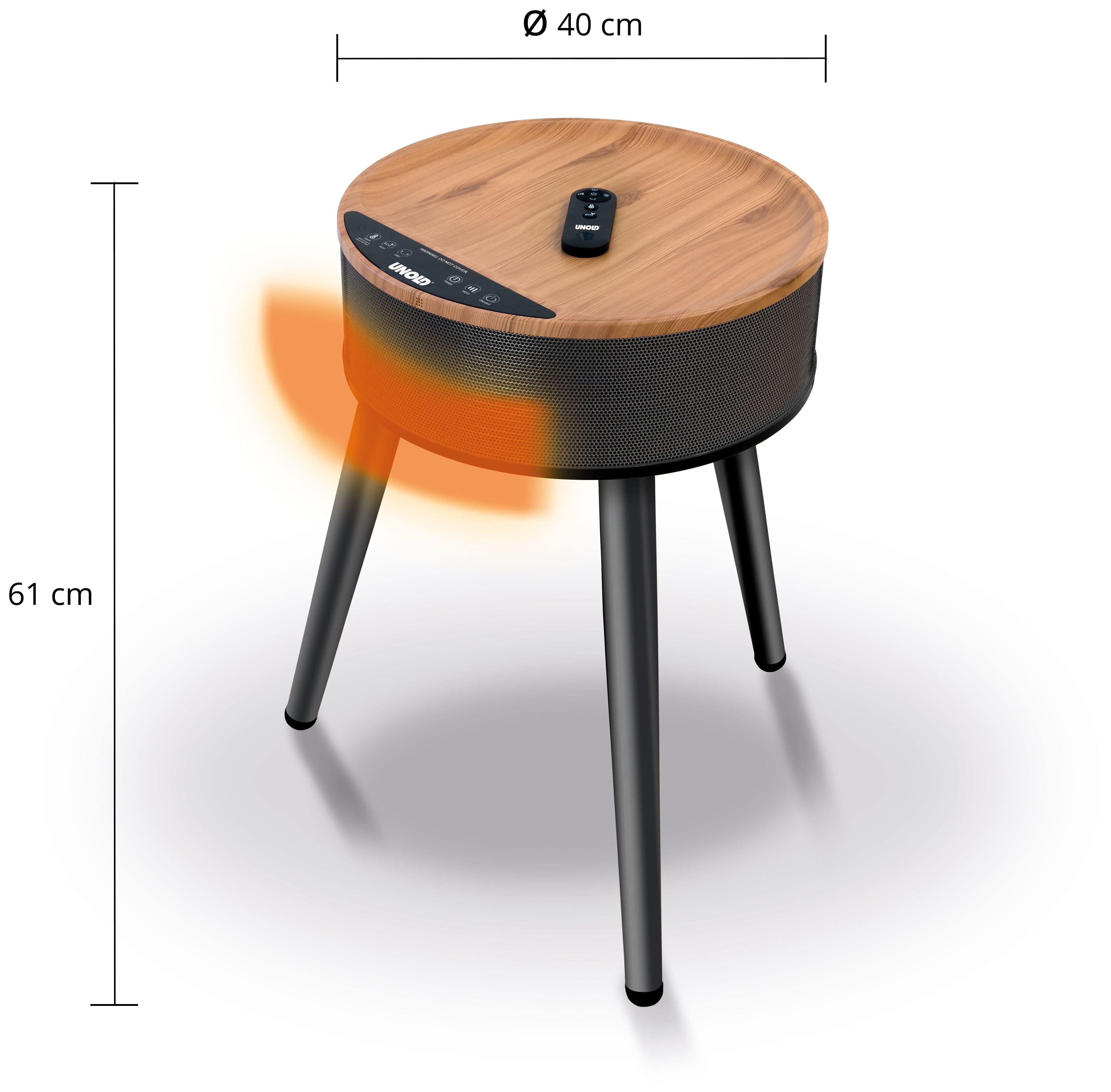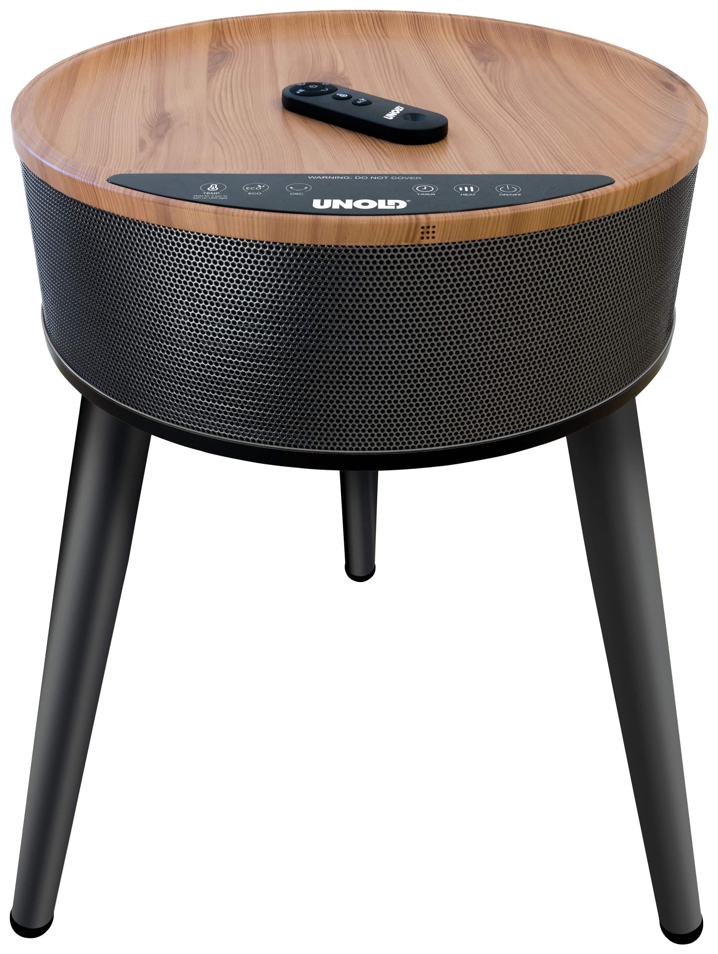Unold HEIZLÜFTERTISCH Henry 86545. Typ: Elektrischer Raumheizlüfter, Heizelement Typ: Keramik, Kabellänge: 1,2 m. Geeignet für: Drinnen, Produktfarbe: Schwarz, Holz, Gehäusematerial: Kunststoff. Geeignet für Räume bis zu: 30 m². Leistung: 2000 W, AC Eingangsspannung: 220-240 V, AC Eingangsfrequenz: 50-60 Hz. Breite: 465 mm, Tiefe: 492 mm, Höhe: 610 mm