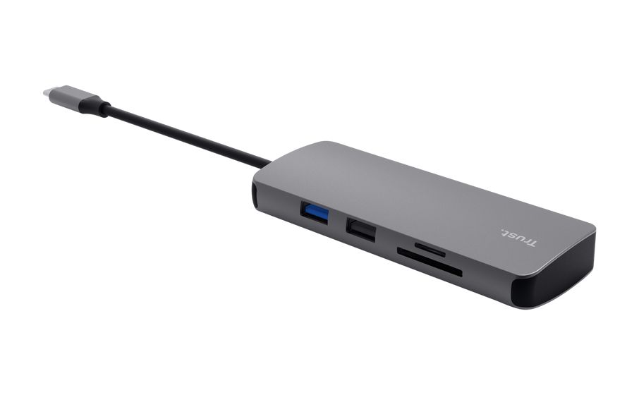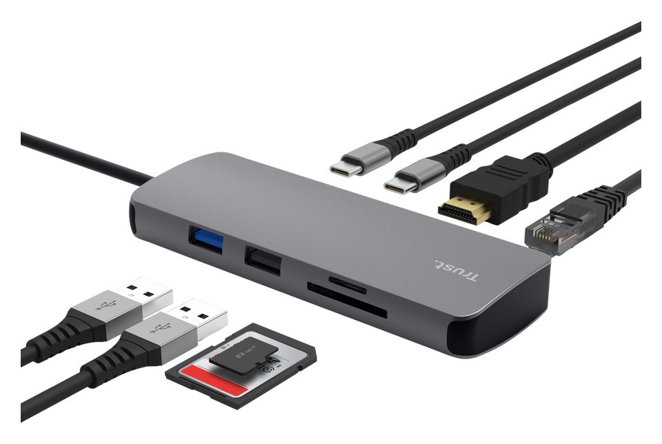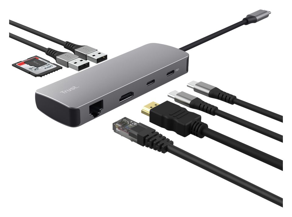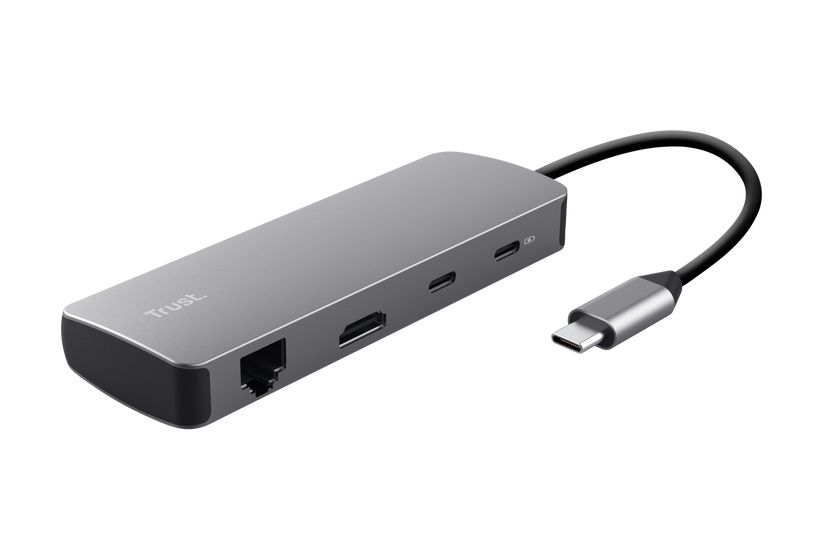 Eleganter Multiport-Adapter aus Aluminium, der Ihren Laptop über einen einzigen USB-C-Anschluss mit Anschlüssen für HDMI, Netzwerk, Kartenlesegerät, USB-C und USB ausstattet