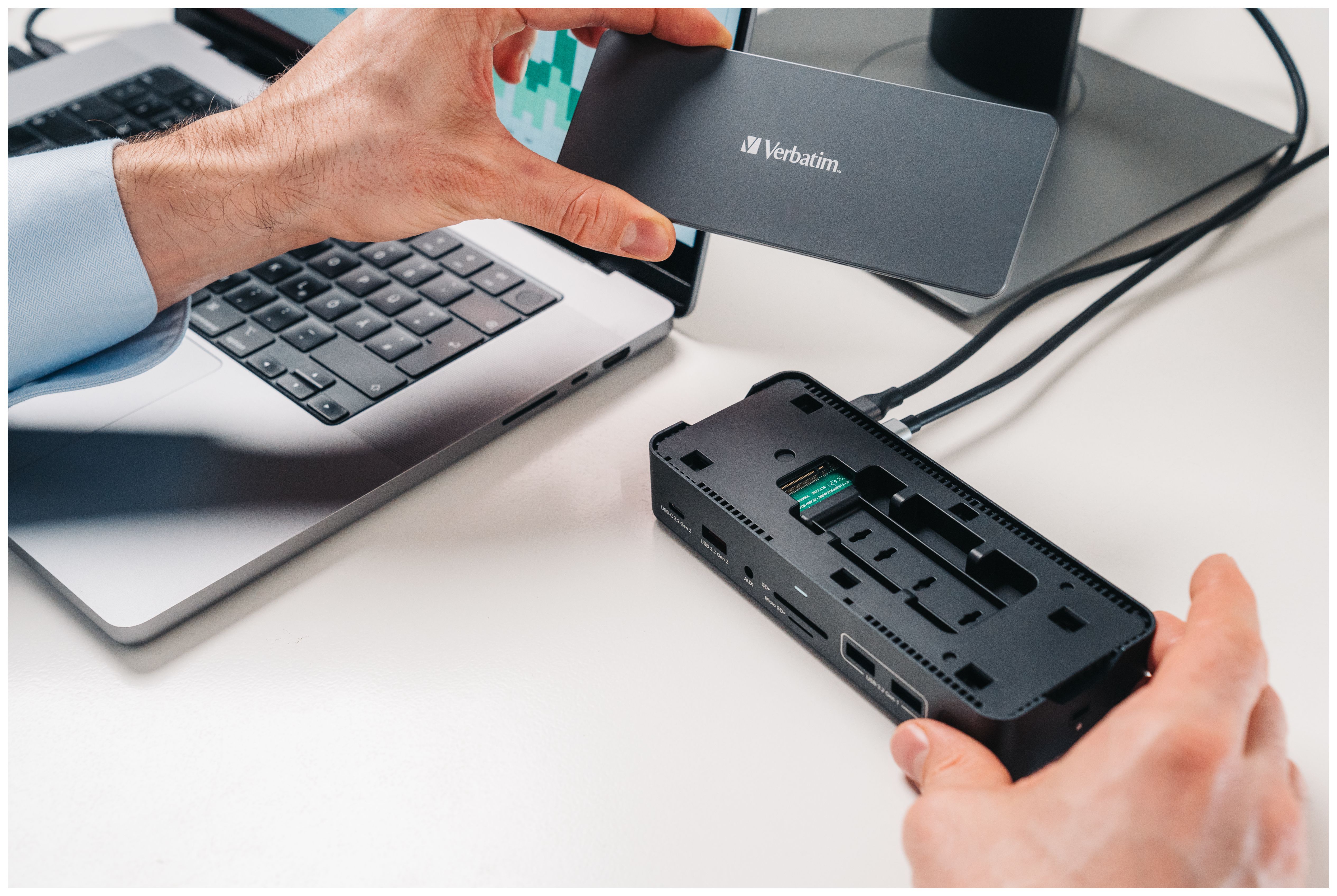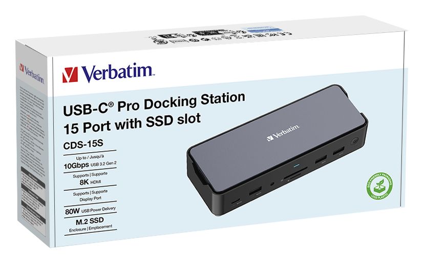 Verbatim CDS-15S. Übertragungstechnik: Kabelgebunden, Hostschnittstelle: USB 3.2 Gen 1 (3.1 Gen 1) Type-C, USB-Stromversorgung bis zu: 100 W. Ethernet LAN Datentransferraten: 1000 Mbit/s. Produktfarbe: Schwarz, Grau, Kompatible Speicherkarten: MicroSD (TransFlash), SD, SSD Schnittstelle: M.2, Micro SATA III. Energiequelle: USB, Netzstecker: USB Typ-C, Eingangsstrom: 0.9 A. Unterstützt Windows-Betriebssysteme: Windows 10, Windows 11, Unterstützt Mac-Betriebssysteme: Mac OS X 10.2 Jaguar, Mac OS X 10.3 Panther, Mac OS X 10.4 Tiger, Mac OS X 10.5 Leopard, Mac OS X...