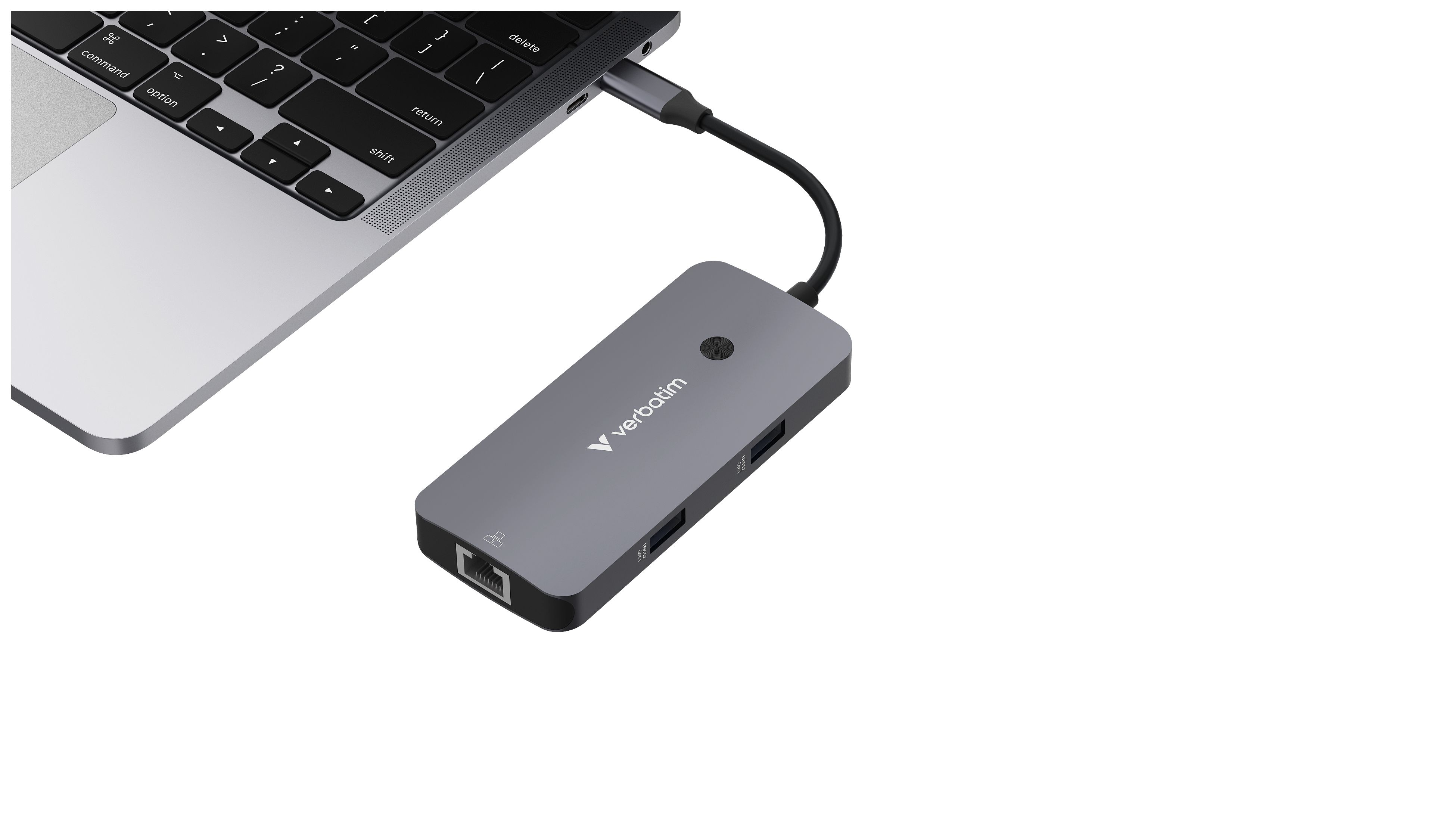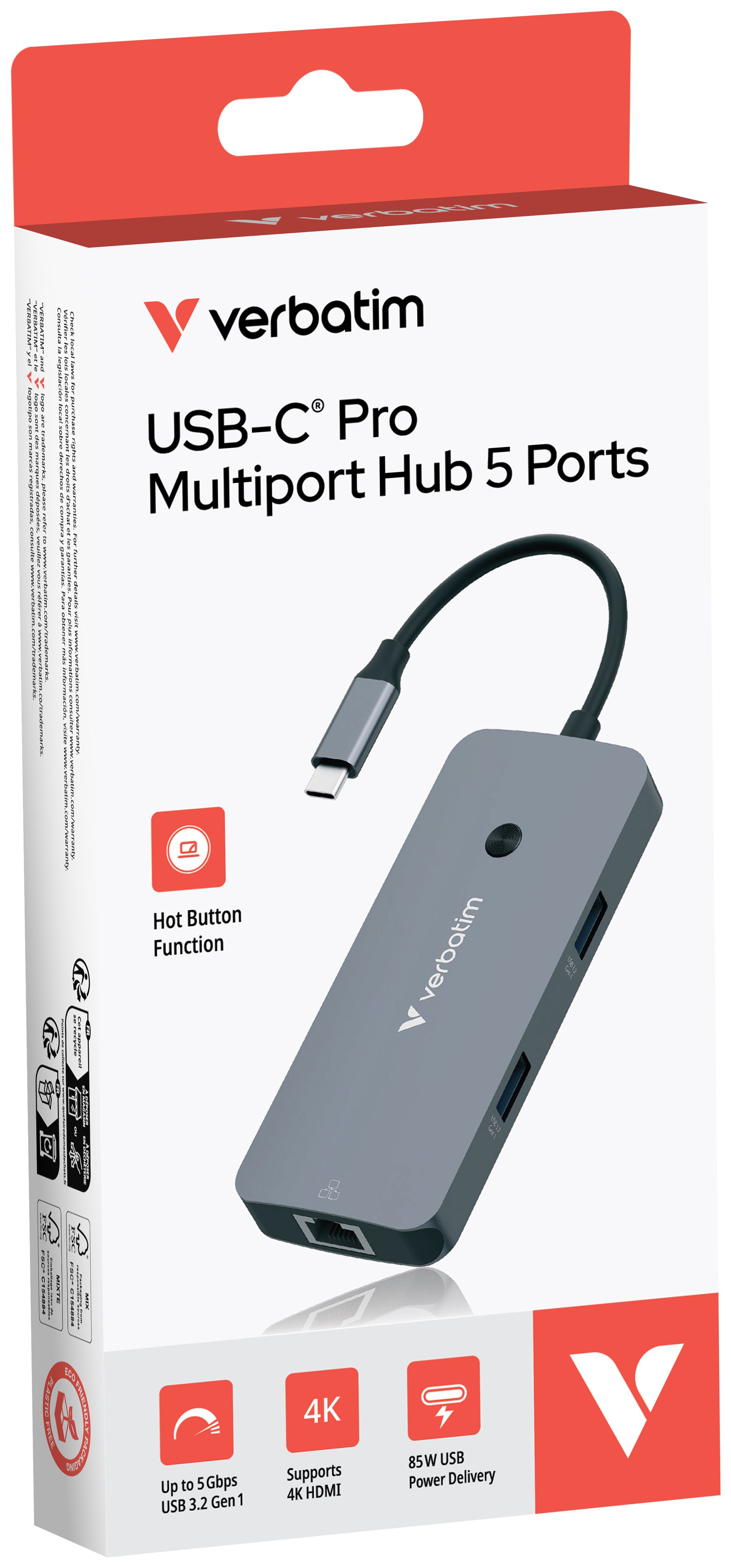 Profitieren Sie von zusätzlichen Anschlussmöglichkeiten, indem Sie einen einzelnen USB-C®-Anschluss mit dem USB-C Pro 5 Port Multiport-Hub von Verbatim in fünf Anschlüsse verwandeln. Mit einem HDMI-Anschluss zur Verbindung von kompatiblen Fernsehgeräten, einem Gigabit-Ethernet-Anschluss zur Internetverbindung per Kabel, zwei USB-A-Anschlüssen sowie einem USB-C PD-Anschluss zum ununterbrochenen Durchlaufladen.