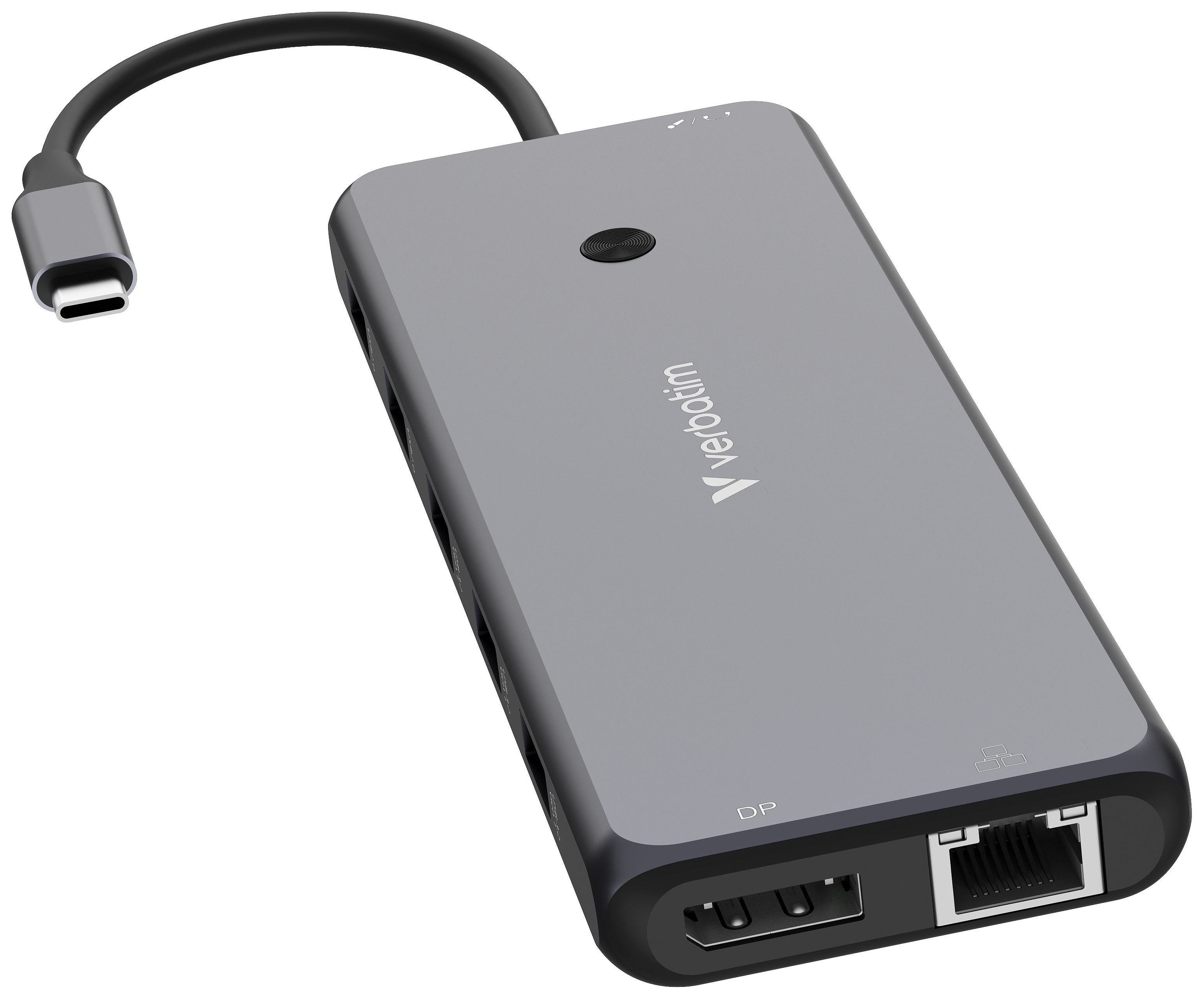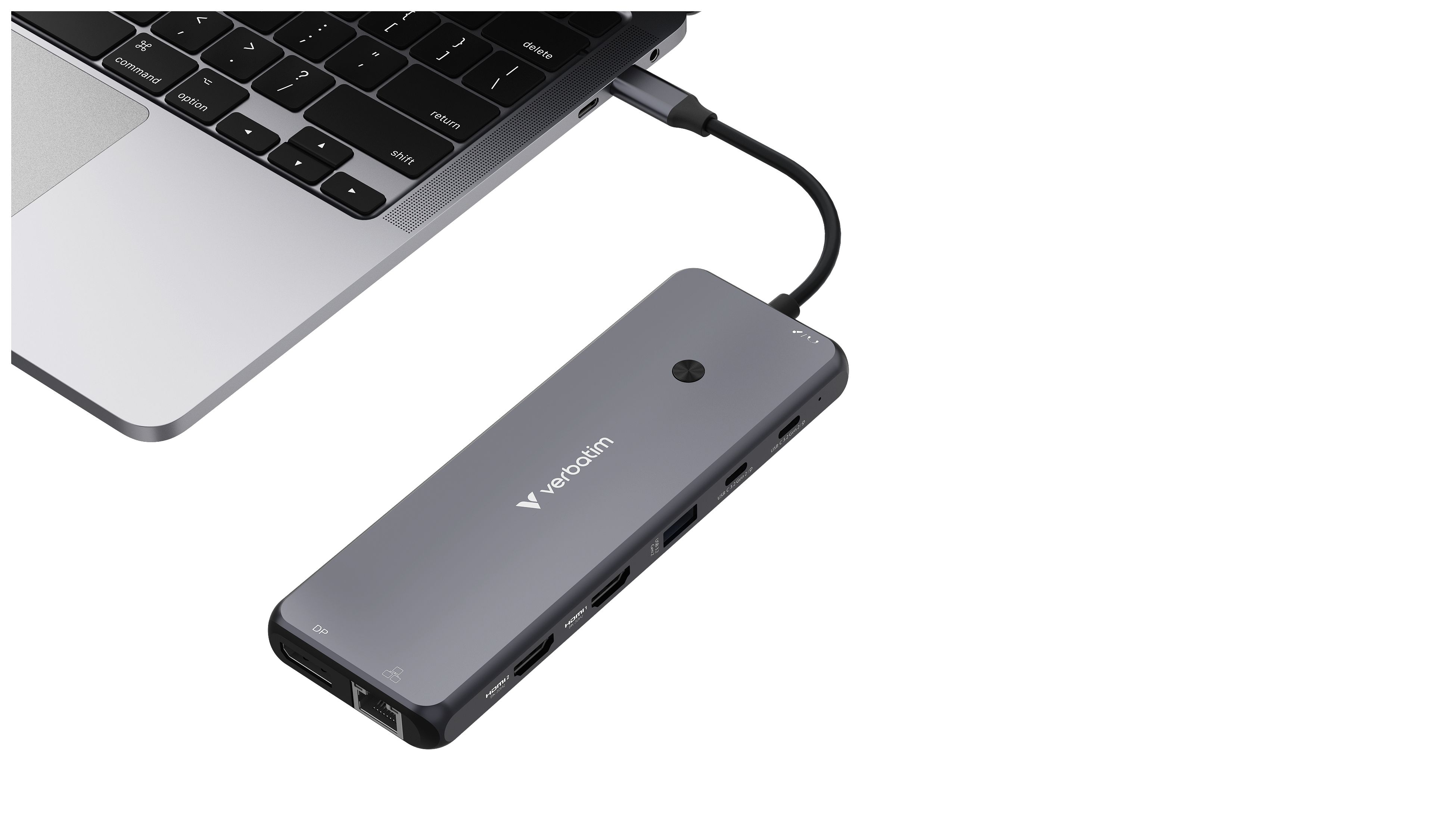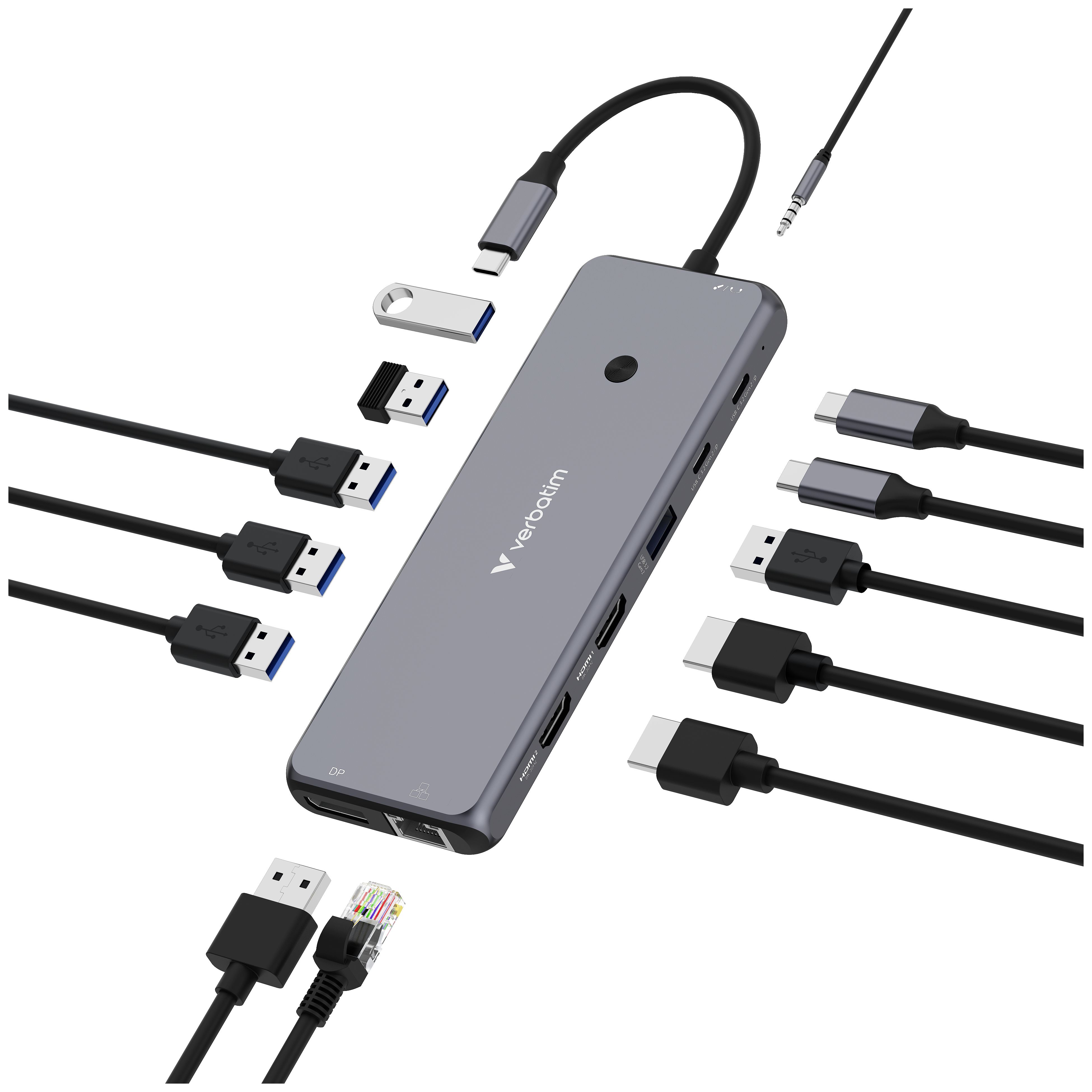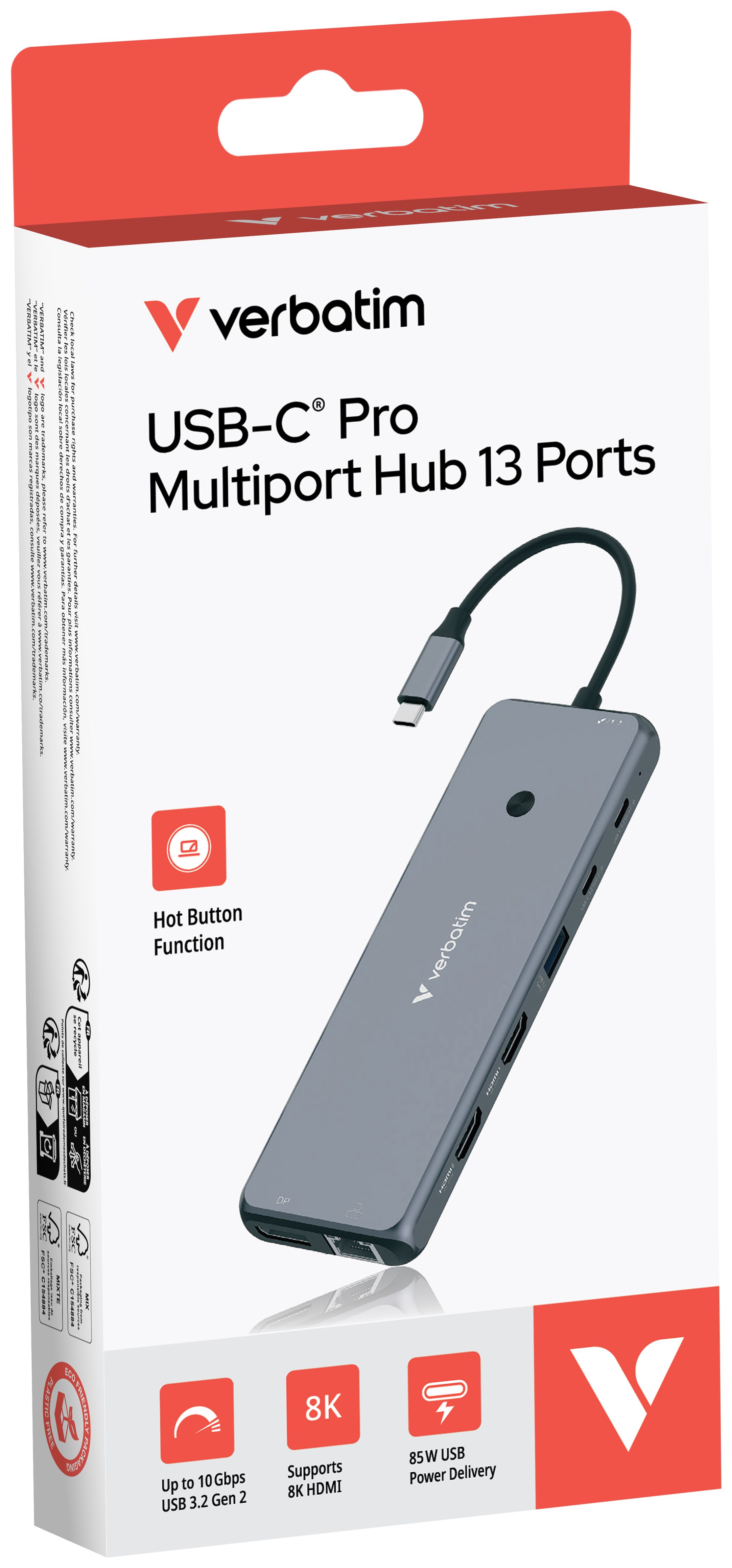 Der USB-C® Pro 13-Port Multiport-Hub von Verbatim ist mit dreizehn Anschlussmöglichkeiten ausgestattet – darunter zwei HDMI-Anschlüsse und einem DisplayPort für das Arbeiten mit drei Monitoren. Dieser Hub ist ideal für Entwickler und Kreative: Mit dem Gigabit-Ethernet-Anschlusses kann man von den Geschwindigkeiten einer kabelgebundenen Internetverbindung profitieren und Lautsprecher oder ein Headset können über den Audioanschluss verbunden werden. Mit seinen sage und schreibe sechs USB-A-Anschlüssen verschiedener Generationen unterstützt der Hub Geräte mit unterschiedlichen Geschwindigkeiten. Zudem ist das Laden Ihrer Geräte mit zwei USB-C PD (Power Delivery)-auch gewährleistet.