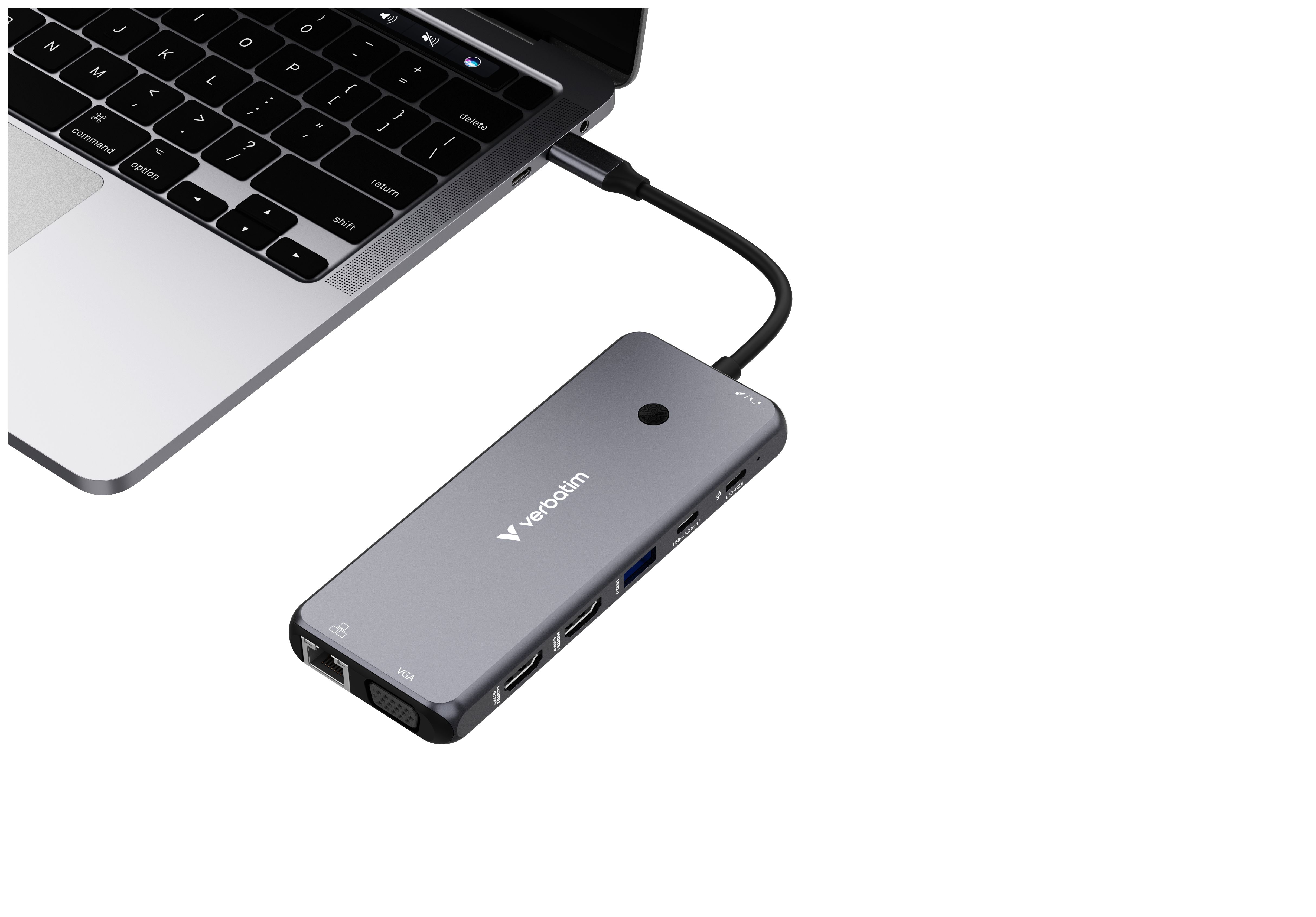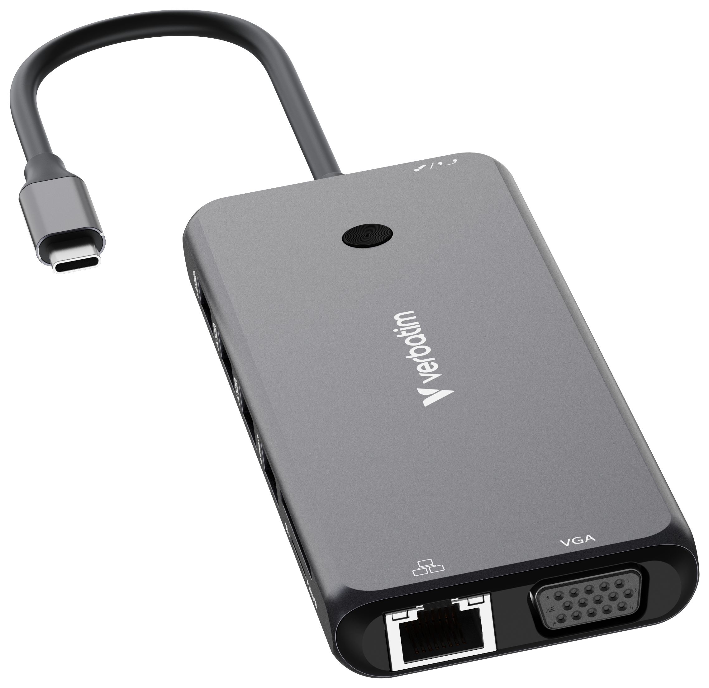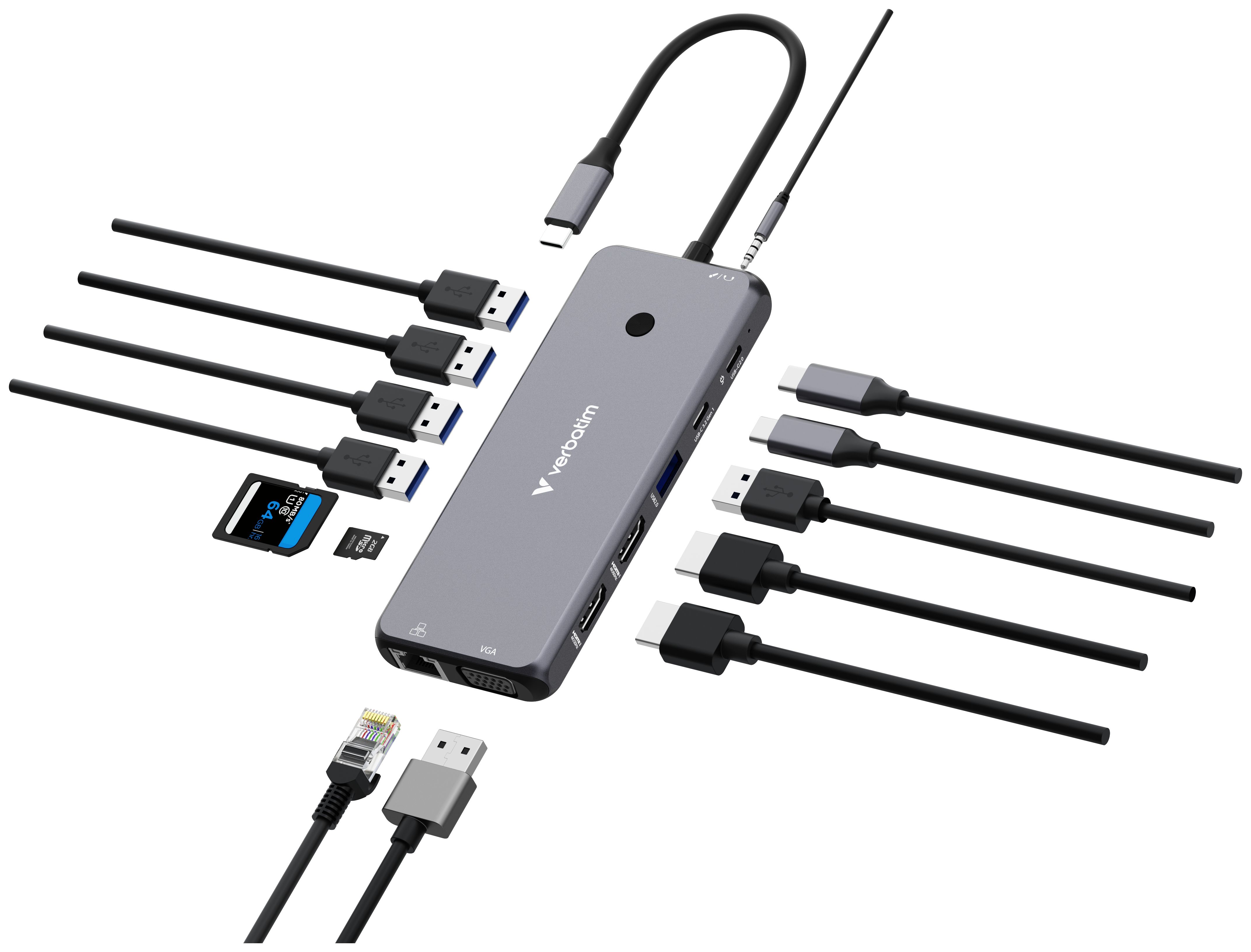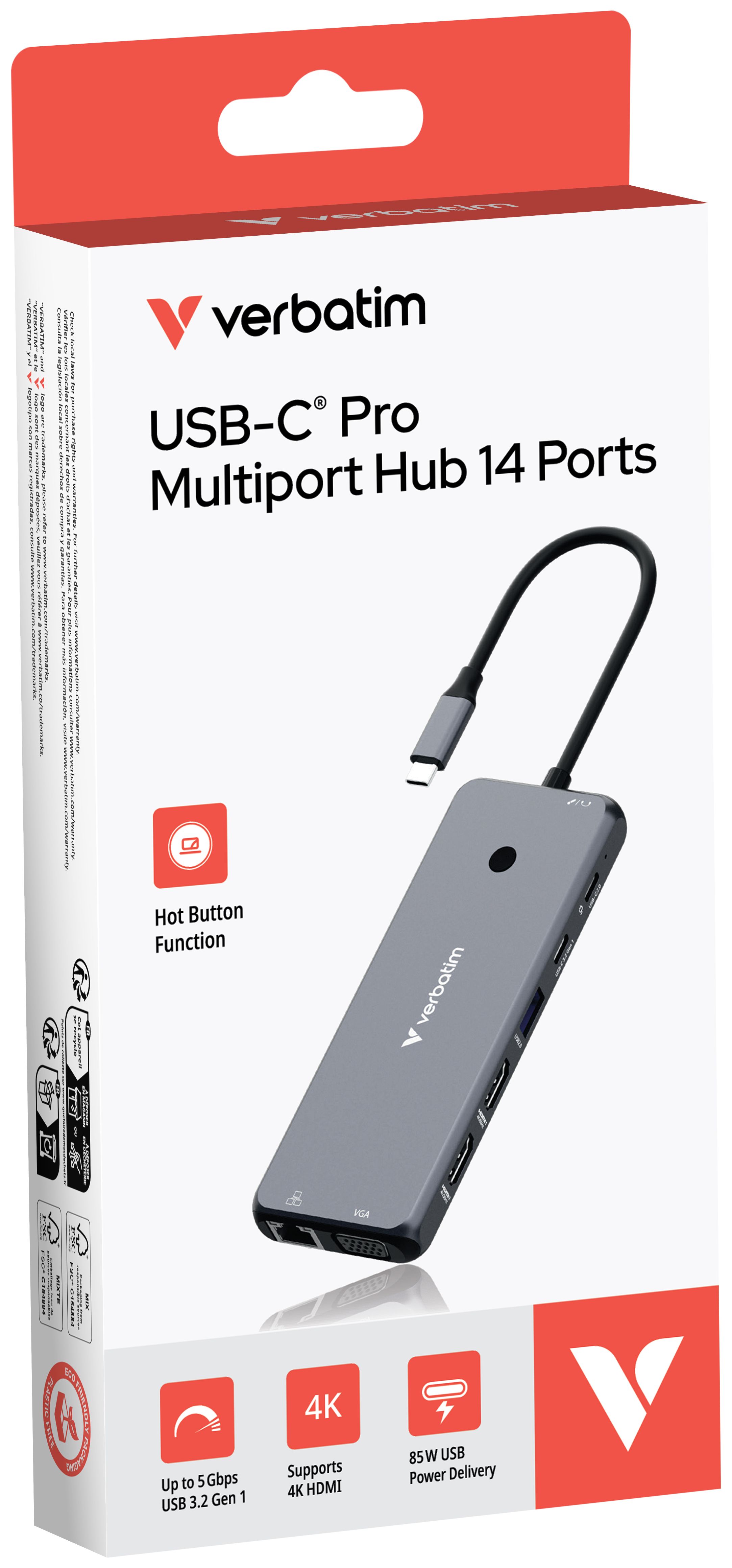 Der USB-C® Pro 14-Port Multiport-Hub von Verbatim bietet enorm viele Anschlussmöglichkeiten. Vierzehn Anschlüsse – darunter zwei HDMI-Anschlüsse sowie ein VGA-Anschluss für ältere Monitore – ermöglichen das Betrachten und Arbeiten mit mehreren Monitoren. Die vielen USB-Anschlüsse – darunter fünf USB-A- und zwei USB-C-Anschlüsse, einer davon USB-C PD – eröffnen die Möglichkeit, mehrere Geräte zu nutzen und von einer kabelgebundenen Internetverbindung über den Gigabit-Ethernet-Anschlusses zu profitieren. Für aufstrebende Fotografen oder ambitionierte Hobby-Fotografen bietet der Hub zum schnellen und unkomplizierten Übertragen von Fotos und Videos Steckplätze für SD- und microSD-Speicherkarten. Mit der 3,5 mm-Buchse wird der Einsatz von Lautsprechern oder einem Headset einfach und praktisch.