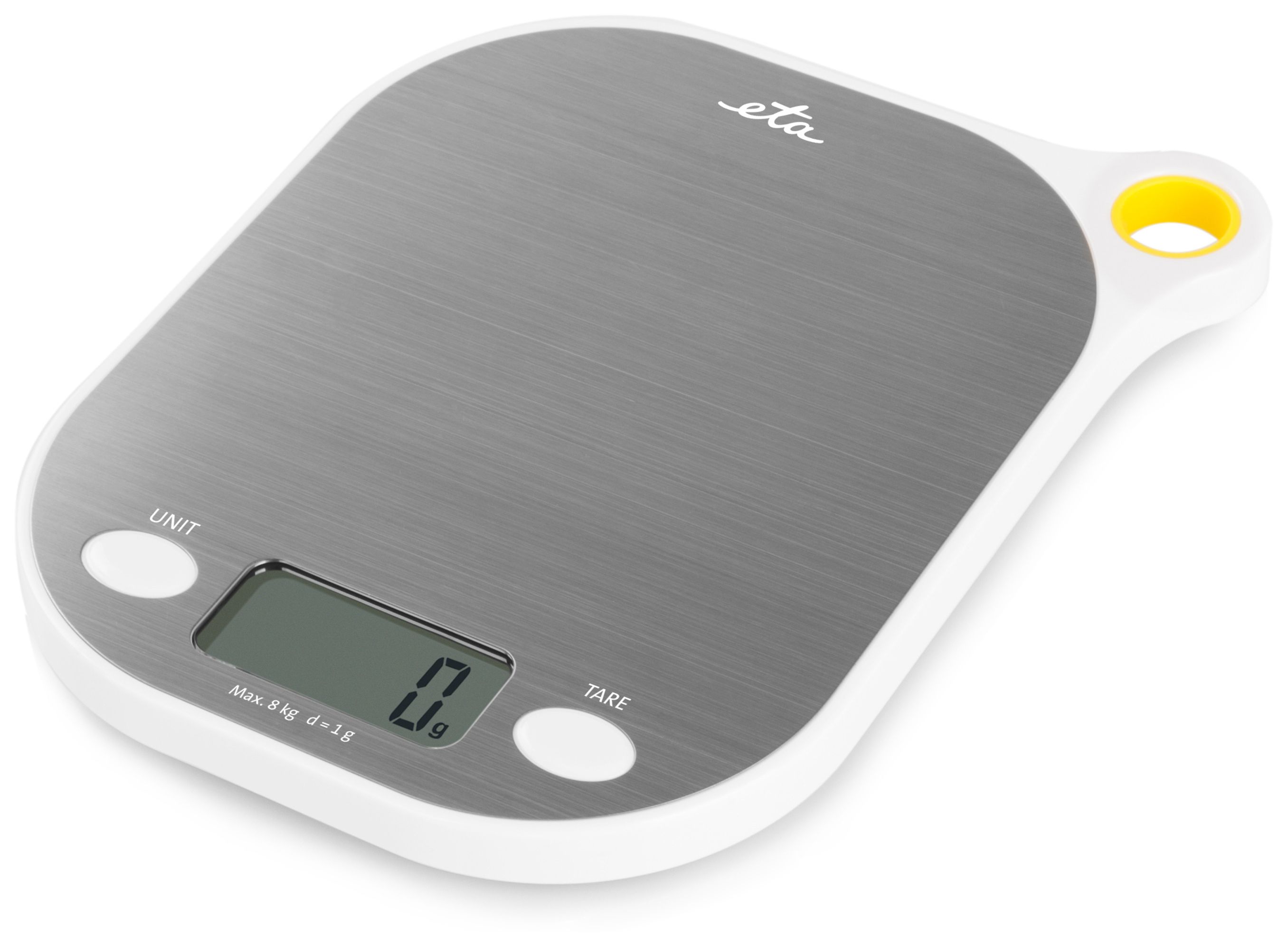 Die digitale Küchenwaage ETA Grami mit Edelstahl- Wiegefläche hat eine Tragfähigkeit von bis zu 8 kg und wiegt auf 1 g genau.