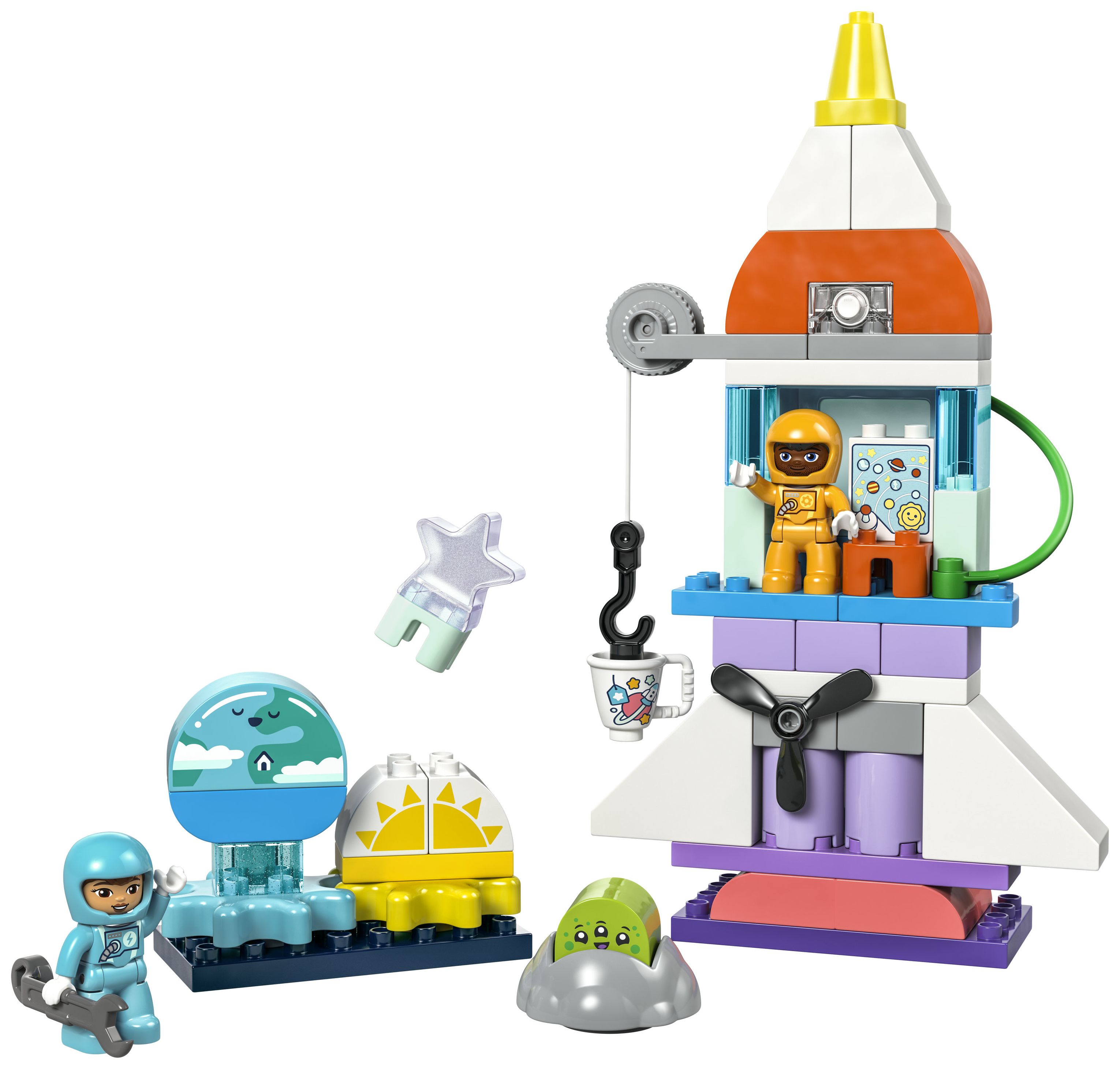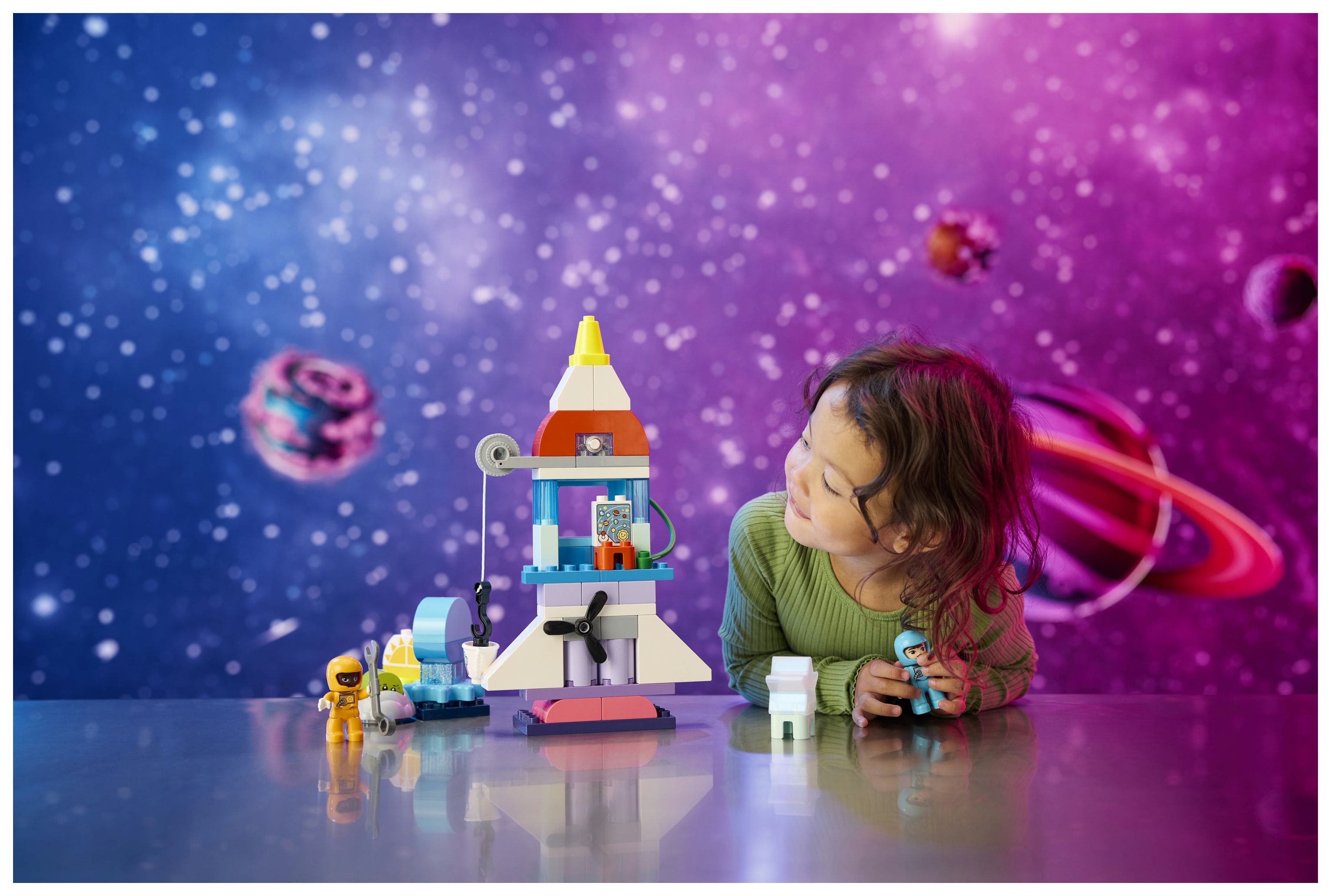 Das vielfältige Zubehör in diesem Weltraumspielset lässt Kinder besonders kreativ spielen. Vorschulkinder erschließen neue Horizonte und denken sich spannende Weltraumabenteuer für die 2 LEGO® DUPLO® Astronautenfiguren aus, die zum Beispiel mit Aliens Freundschaft schließen oder einen Weltraumspaziergang machen, um die Rakete mit dem Schraubenschlüssel zu reparieren.