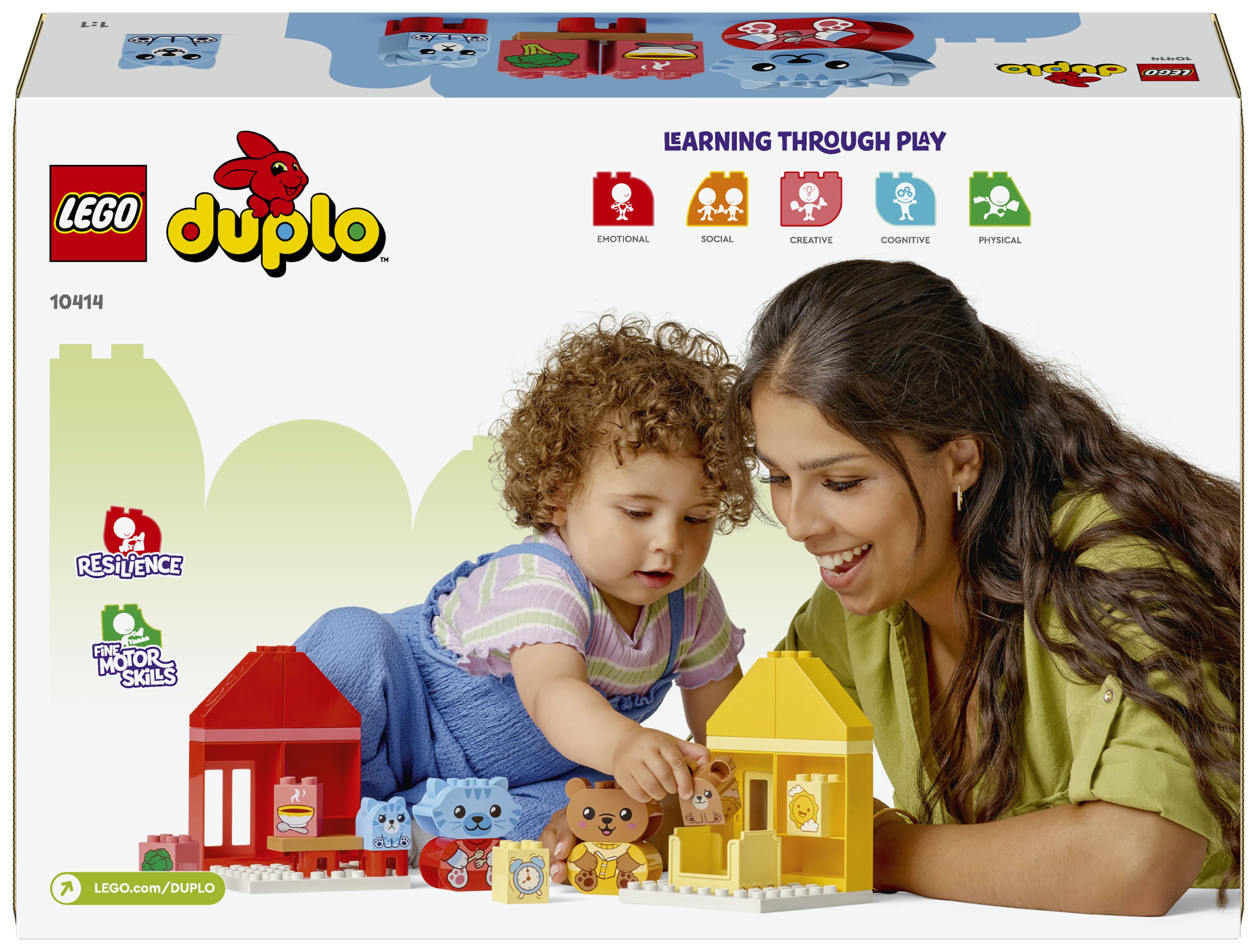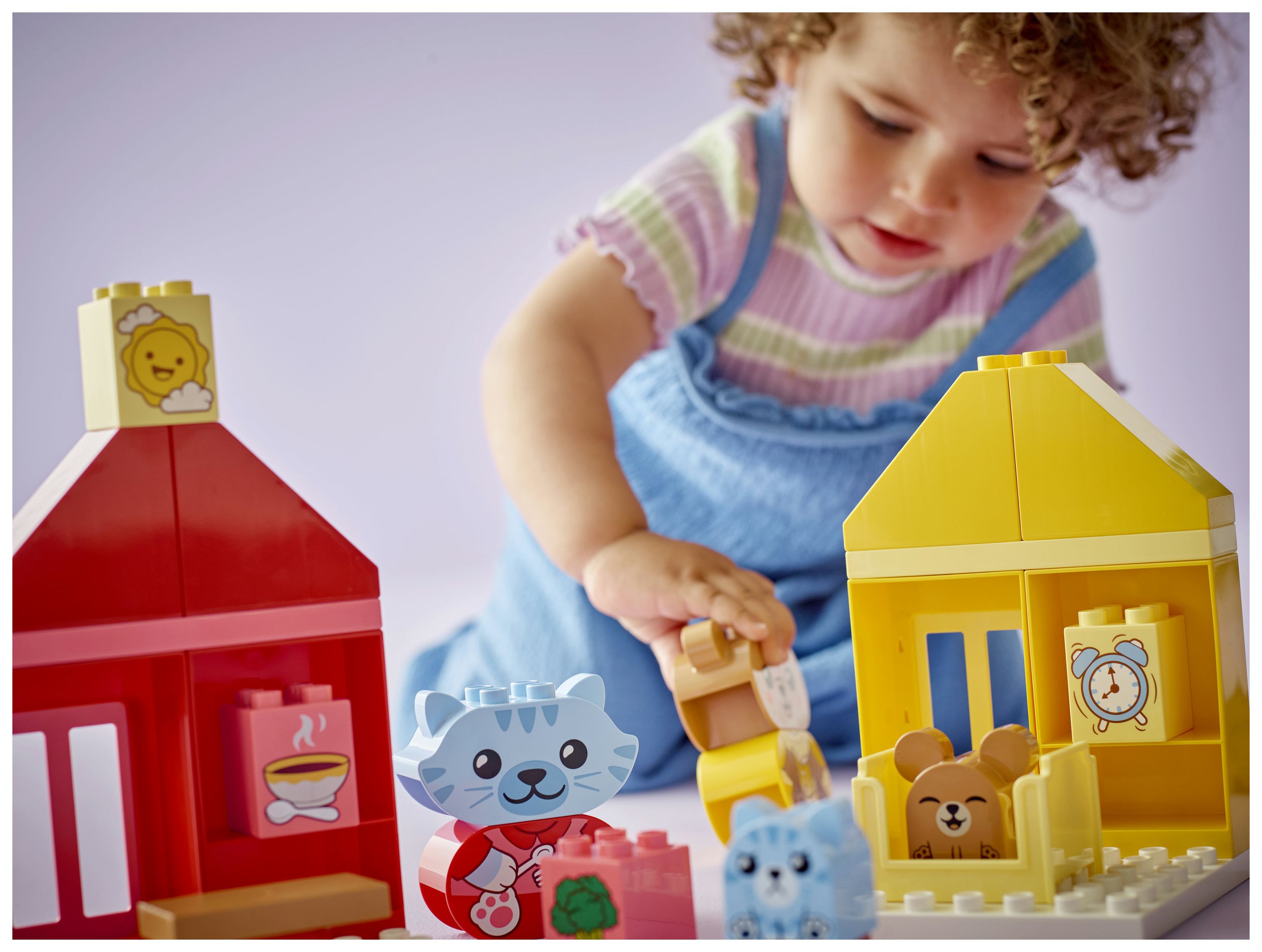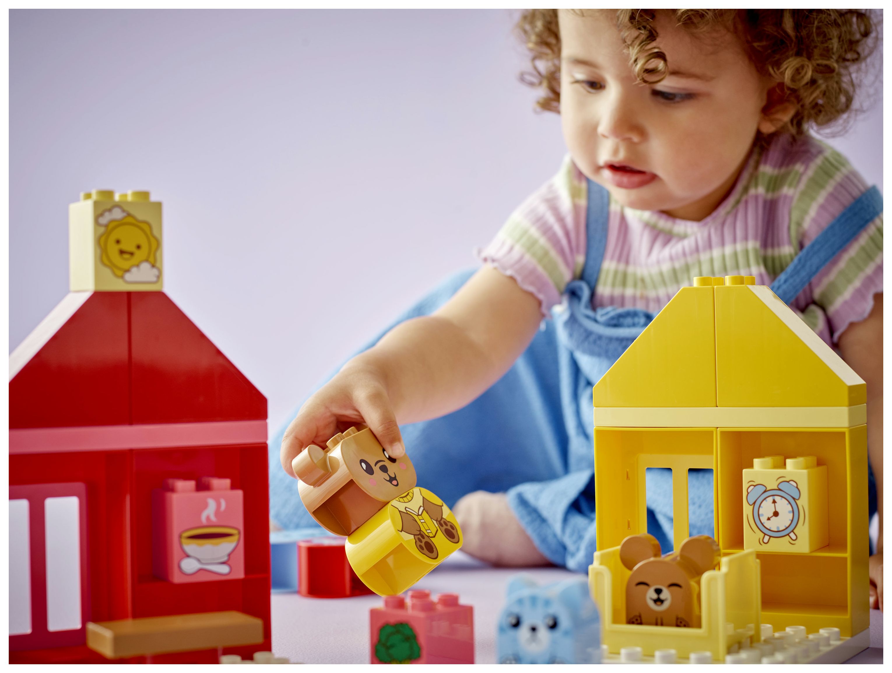 LEGO DUPLO Sets eignen sich besonders gut für spielerisches Lernen. Bei unterhaltsamen interaktiven Rollenspielen können die Eltern die Spielzeugfiguren benutzen, um Kleinkindern zu erklären, wie wichtig Alltagsroutinen sind. Kleinkinder entwickeln Fingerfertigkeit, wenn sie die bunten Steine zu 2 Spielzeughäusern zusammenstecken. Beide Alltagsroutinen sind mit farblich übereinstimmenden Steinen dargestellt, damit das Bauen ein Kinderspiel ist.