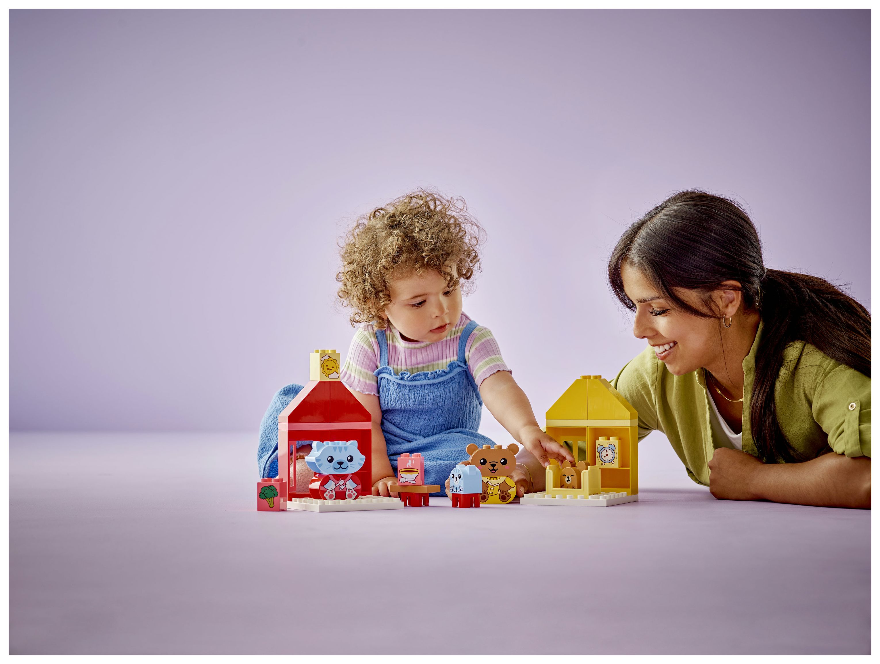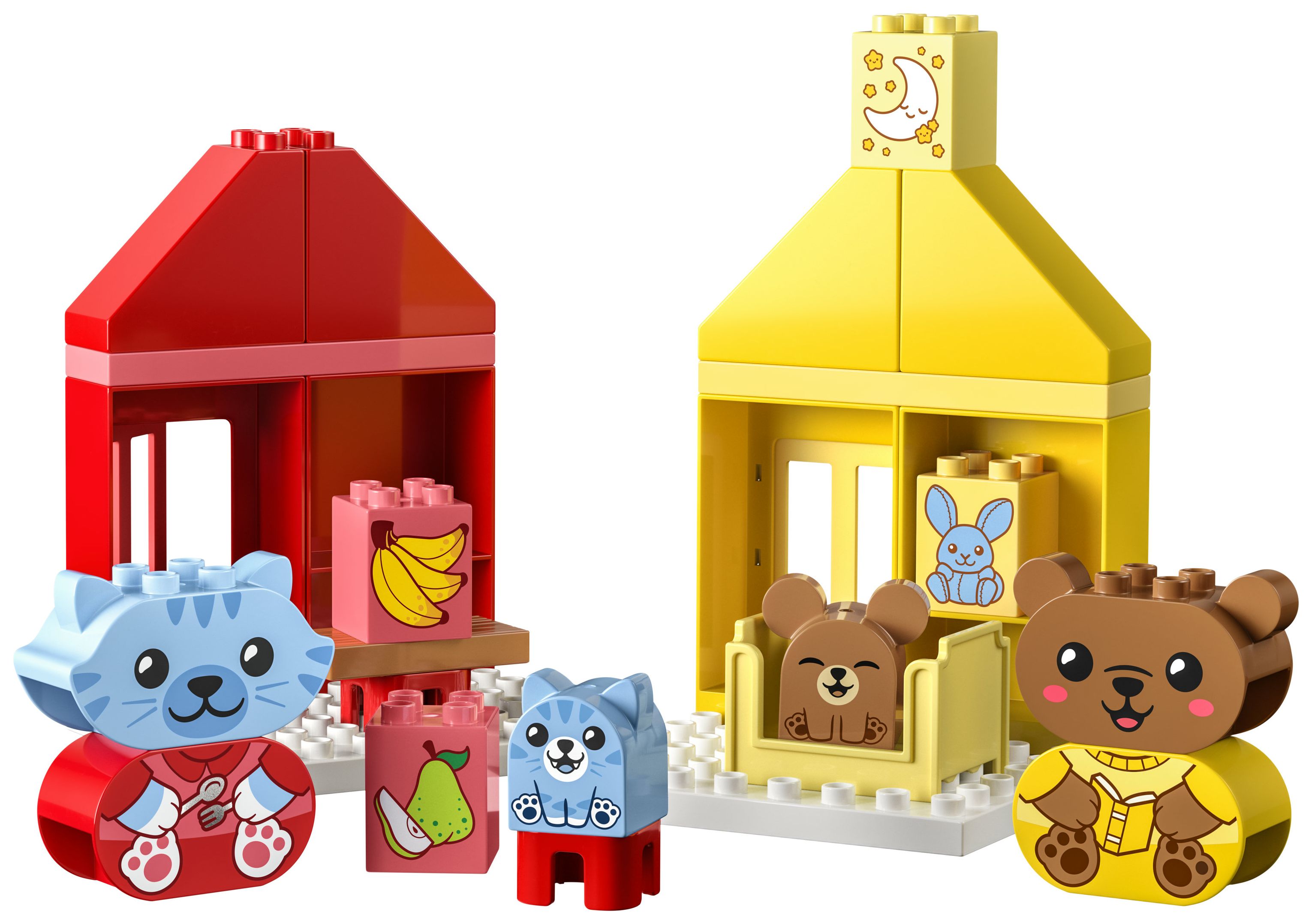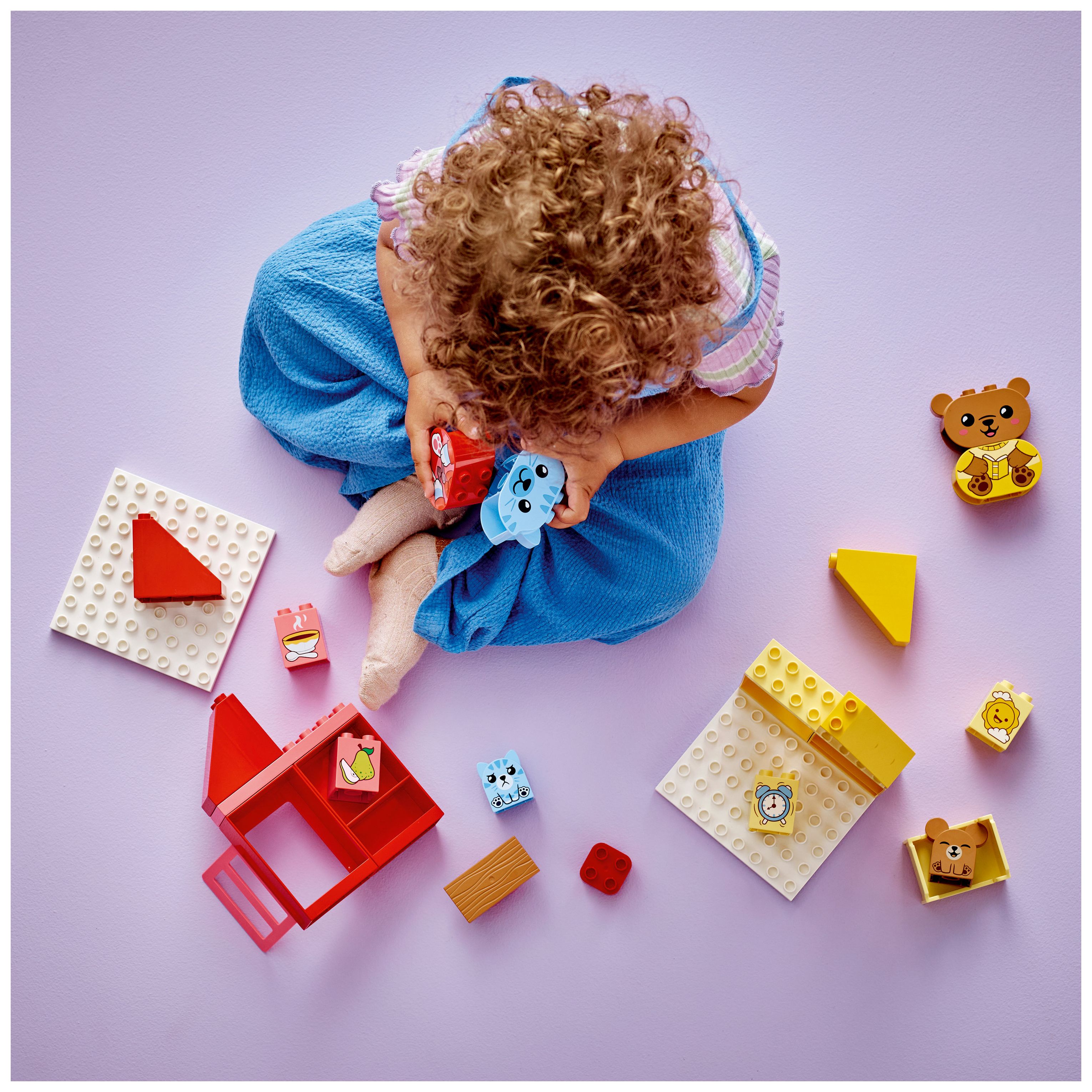 LEGO DUPLO Sets eignen sich besonders gut für spielerisches Lernen. Bei unterhaltsamen interaktiven Rollenspielen können die Eltern die Spielzeugfiguren benutzen, um Kleinkindern zu erklären, wie wichtig Alltagsroutinen sind. Kleinkinder entwickeln Fingerfertigkeit, wenn sie die bunten Steine zu 2 Spielzeughäusern zusammenstecken. Beide Alltagsroutinen sind mit farblich übereinstimmenden Steinen dargestellt, damit das Bauen ein Kinderspiel ist.