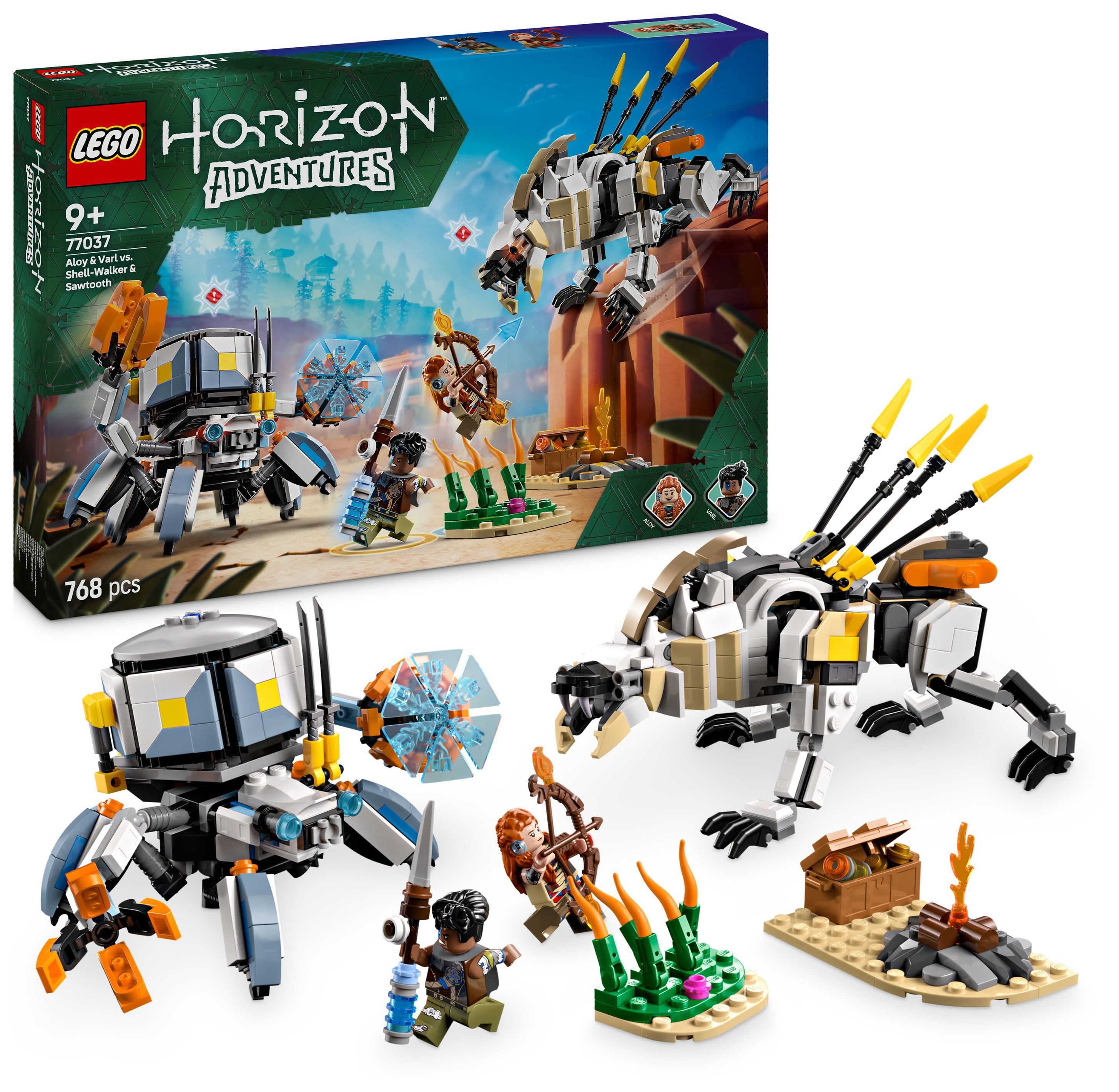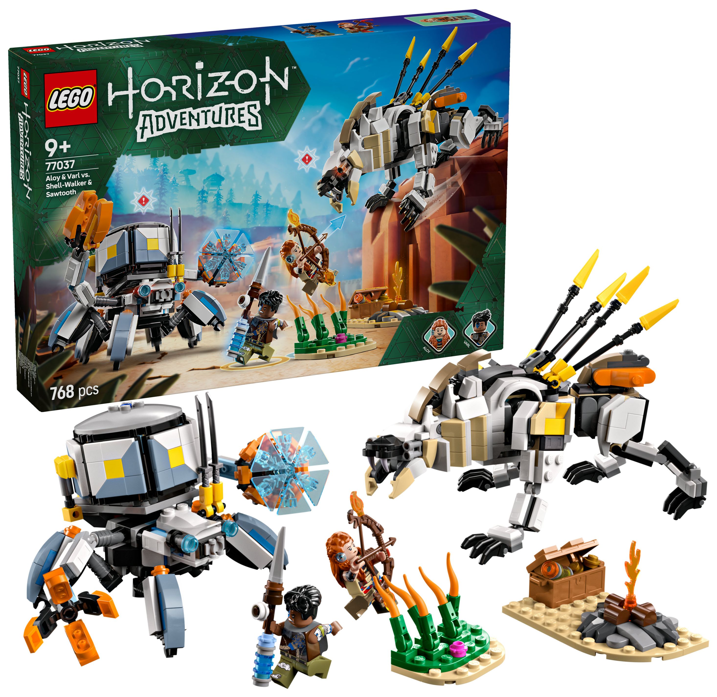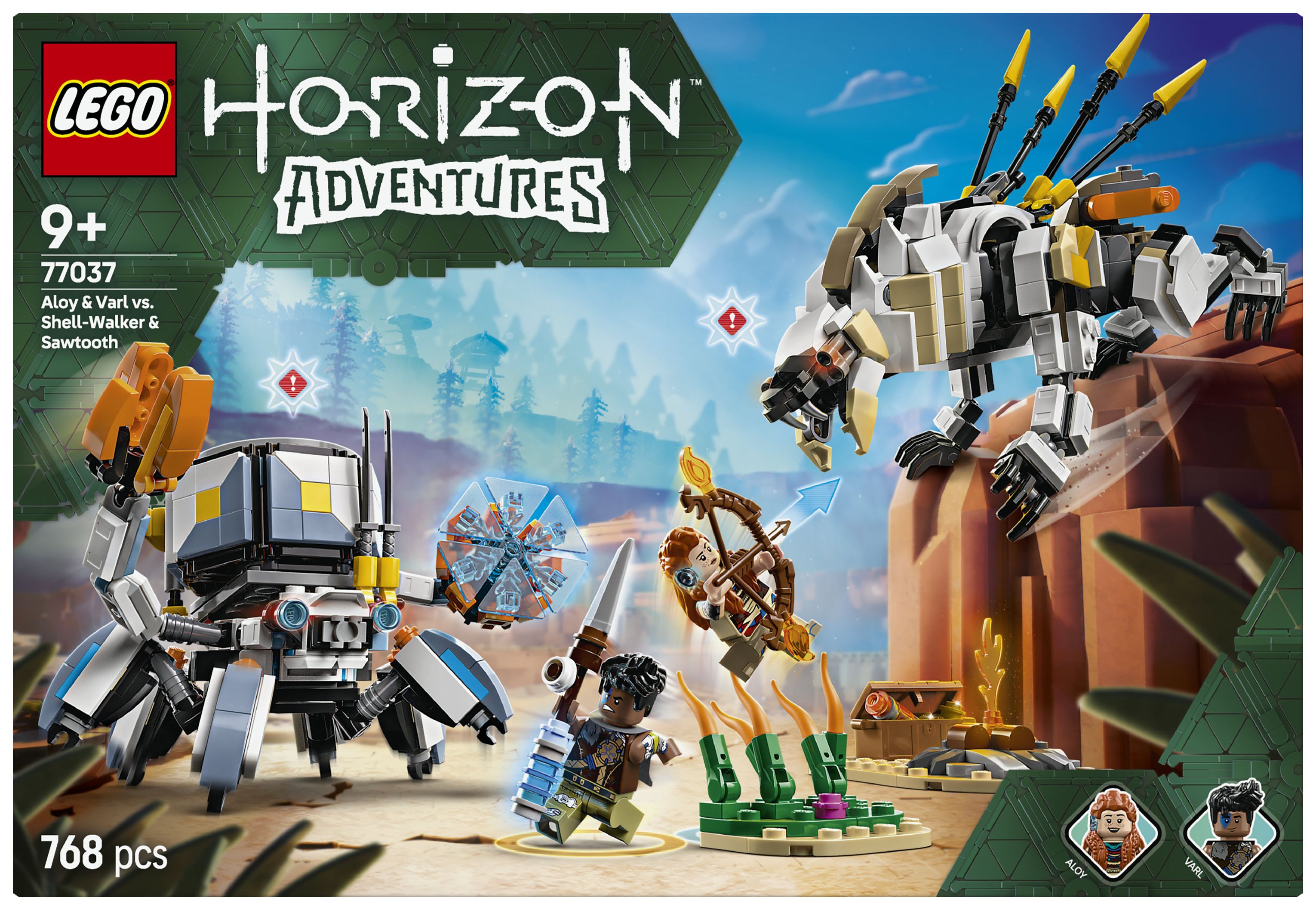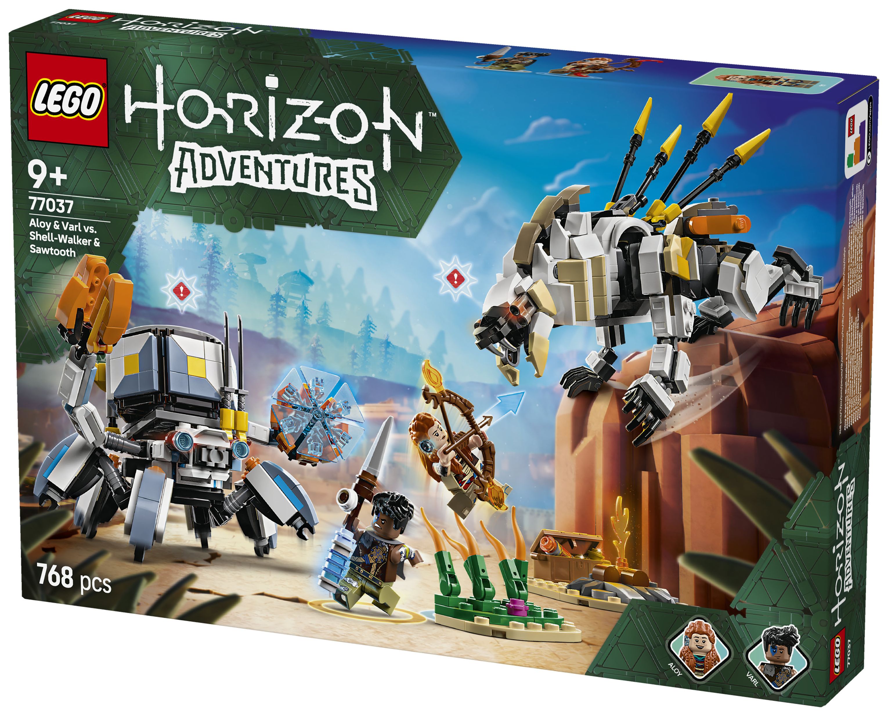 Dieses LEGO Gaming-Set basiert auf dem Videospiel LEGO Horizon Adventures und beinhaltet neben den Spielzeug-Monstermaschinen auch die beiden Minifiguren Aloy und Varl. Aloy trägt einen Bogen, und ihr treuer Begleiter Varl hält einen Speer. Beide Ausrüstungsgegenstände lassen sich upgraden, um Feuer-, Schock- oder Gefrier-Attacken durchzuführen – genau wie im Videospiel. 2 baubare Spielzeug-Robotermonster sind ebenfalls enthalten. Der Panzerwanderer hat bewegliche Arme und Beine, aufklappbare Klauen, eine abnehmbare Frachtkapsel und einen Energieschild. Der Sägezahn kann seinen Oberkörper drehen und Hals, Kopf und Beine bewegen. Hohes Schilf, ein Lagerfeuer und eine Schatzkiste laden zu fantasievollen Rollenspielen ein. Zusätzlichen digitalen Bauspaß bietet die LEGO Builder App.
